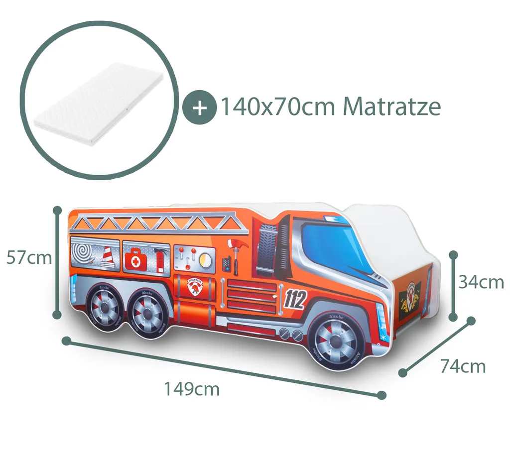 - Das Autobett mit den Außenmaßen von ca. 147 x 54 x 57 cm wird zusammen mit einem Lattenrost und einer gemütlichen Matratze mit Abmessungen von 140 x 70 cm geliefert