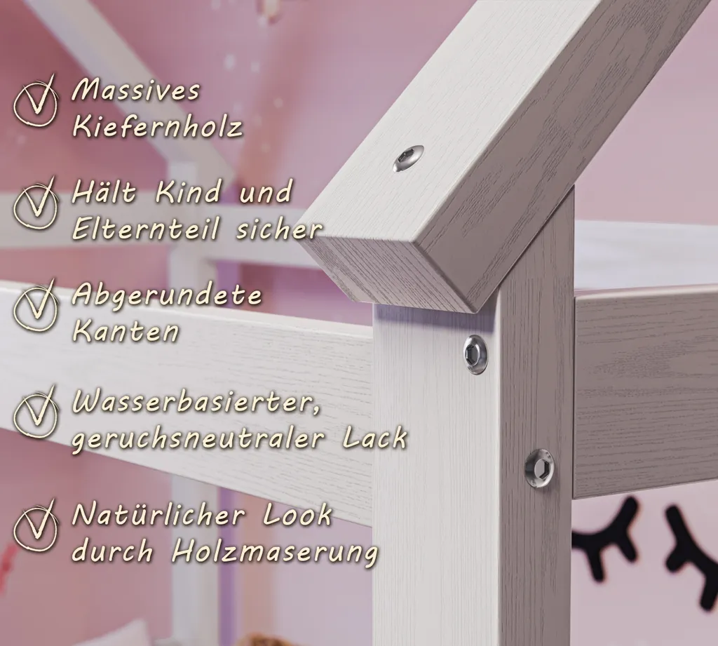 Stabilität: Unser Hausbett Heim wird aus massivem Kiefernholz hergestellt, mit europäischem Qualitätsstandard. Es hält Kind und Elternteil sicher, bei einer Belastbarkeit von 100kg.