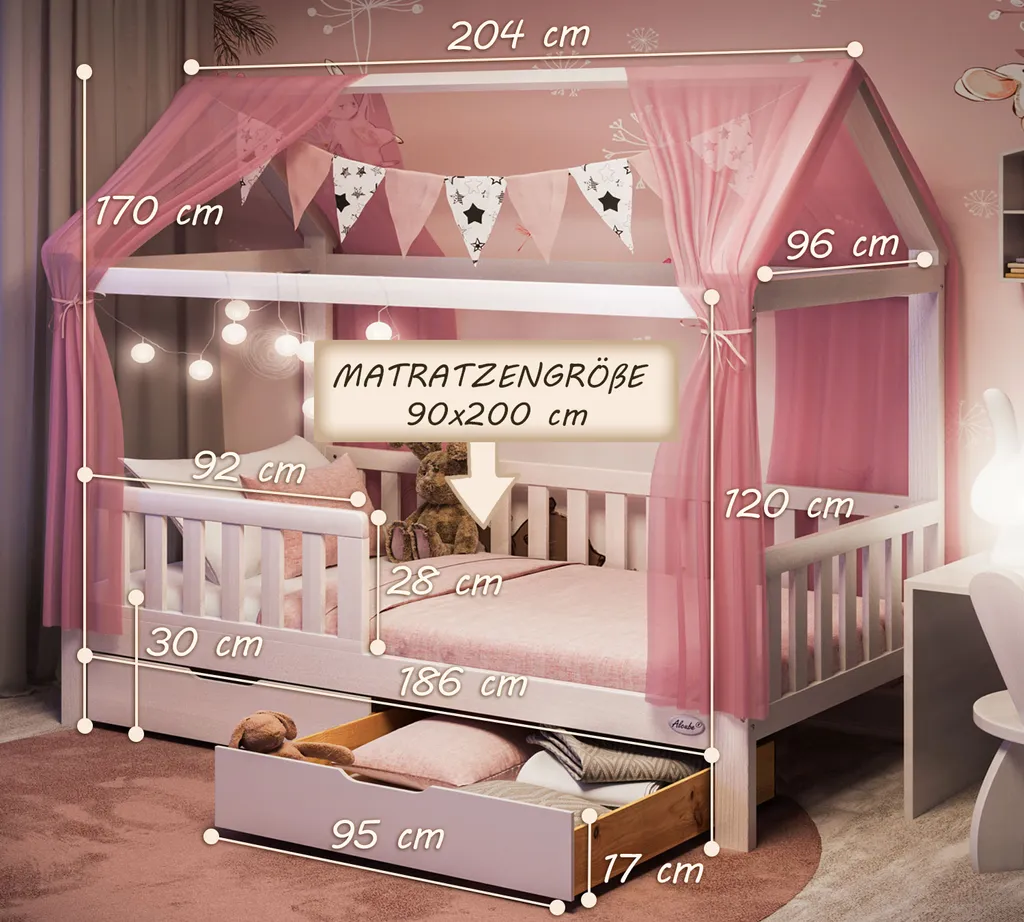 Haus zum Träumen: Hausbett für Kinder ab 3 Jahren. Ein Platz für entspannten Schlaf und süße Träume. Ideal in kleinen Kinderzimmern mit einem Außenmaß von 204x96x170cm.