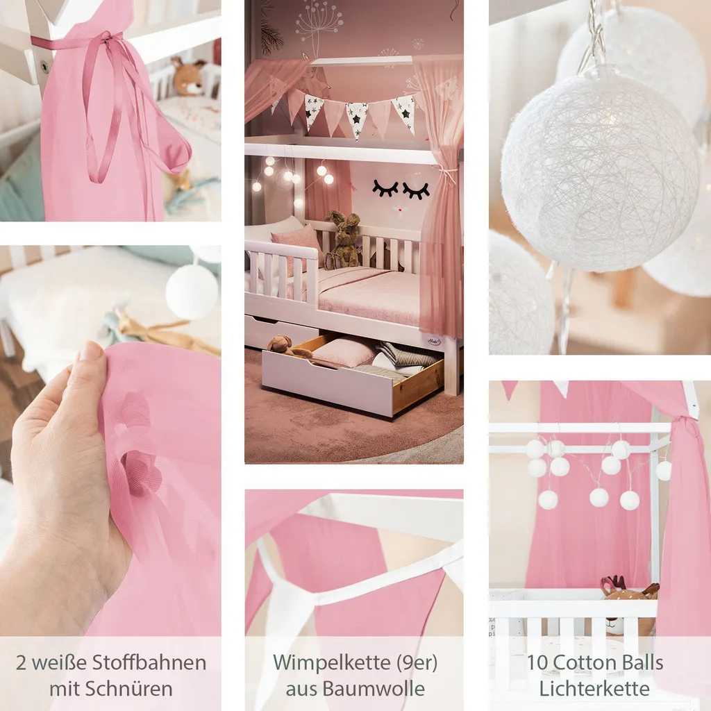 Set: Das Traumhaus für jedes Kind mit passender Matratze, Deko in rosa und praktischer Schublade, die viel Stauraum bietet und für Ordnung im Kinderzimmer sorgt.