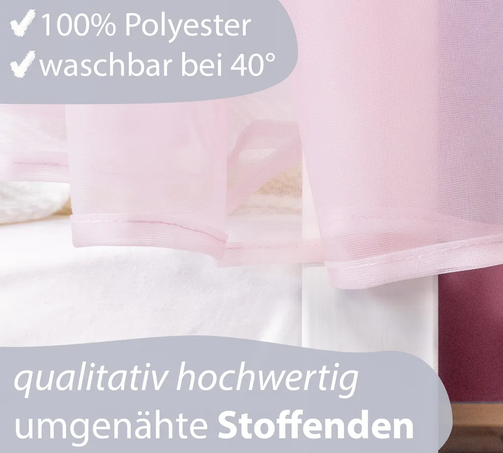 - Baldachin: 2x Vorhang 2,90m x 1,50m mit umgenähten Stoffenden