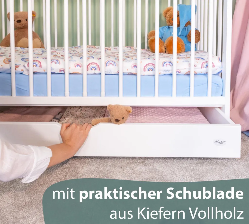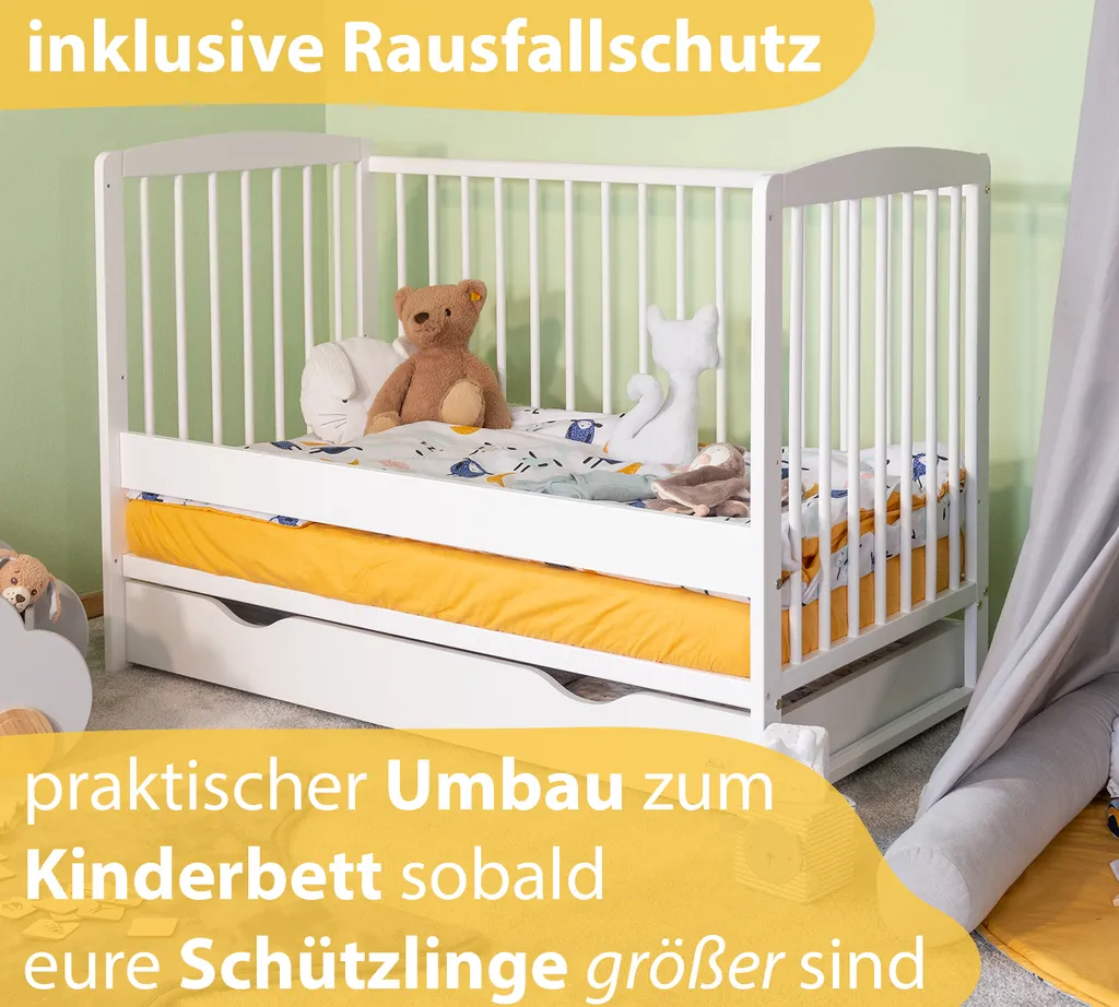 - Ausstattung mitwachsend: Verwendung als Babybett, Laufstall, Beistellbettchen/Zustellbett oder Juniorbett