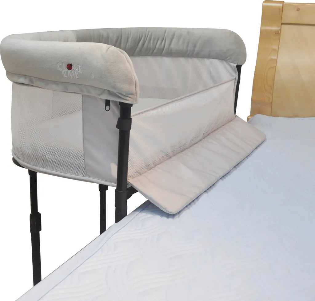 - Zwei an der Vorderseite des Beistellbettchens befindliche Halteschienen werden unter die Polsterung bzw. die Matratze des Elternbetts geführt. Durch das aufliegende Gewicht der Polsterung wird das Close2Me BABY festgehalten. Die Halteschienen sind flach gearbeitet (1 cm hoch), so dass sie Ihren Komfort beim Sitzen auf dem Sofa oder im Bett liegend nicht beeinträchtigen.