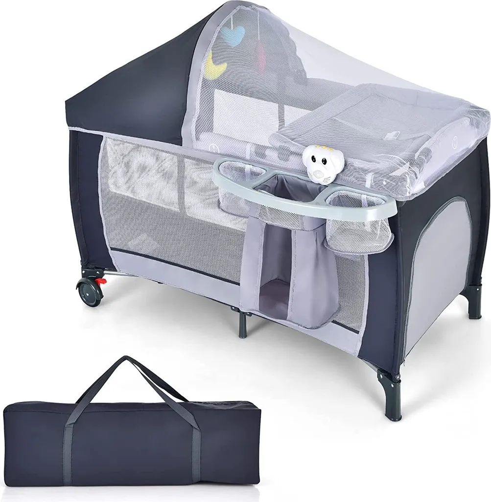 Unser Kinderreisebett mit zwei Ebenen ist eine super Kombination aus Reisebett, Laufstall und Spielplatz, in dem Ihr Schatz nicht nur traumhaft schlafen wird, sondern auch spielend die Welt entdecken kann. Durch die atmungsaktiven Mesh-Gewebe Seitenteile, haben Sie Ihr Baby immer im Blick. Zudem hat das Reisebett eine extra Wickelauflage und einen wunderschönen Spielbogen mit farbigen Kuscheltieren. Dank der seitlichen Pflegebox haben Sie stets alle notwendigen Utensilien griffbereit. Das Reisebett ist schnell wieder auf- und abgebaut und dank der praktischen Transporttasche leicht zu transportieren.