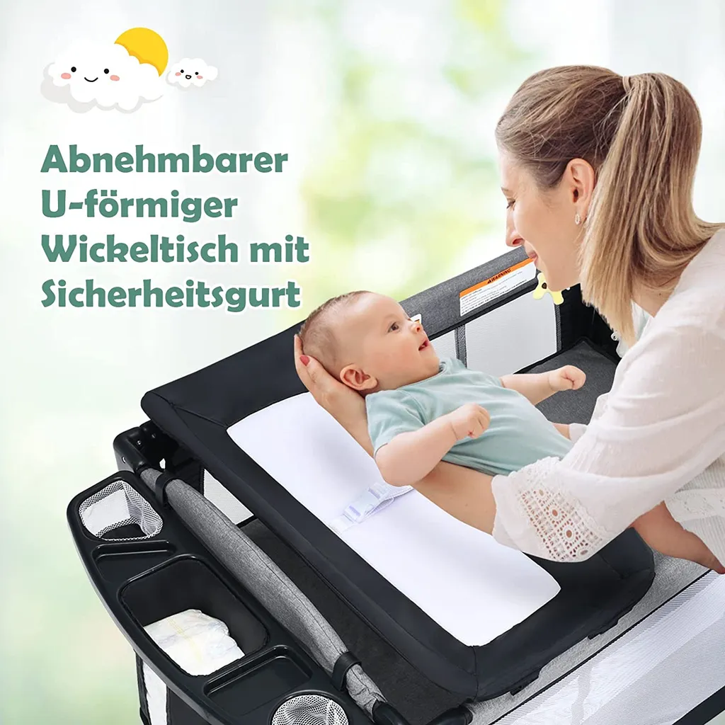 Dieses multifunktionale Babybett kombiniert Wickeltisch, Stubenwagen, Beischlafbett, Babybett und Laufstall, um Ihren unterschiedlichen Bedürfnissen gerecht zu werden. Die 3 hängenden Spielzeuge und die Spieluhr bringen Ihr Baby schnell zum Einschlafen. Die Tasche kann an jeder Armlehne montiert werden und eignet sich perfekt zum Aufbewahren von Windeln, Papierhandtüchern und anderen Notwendigkeiten.