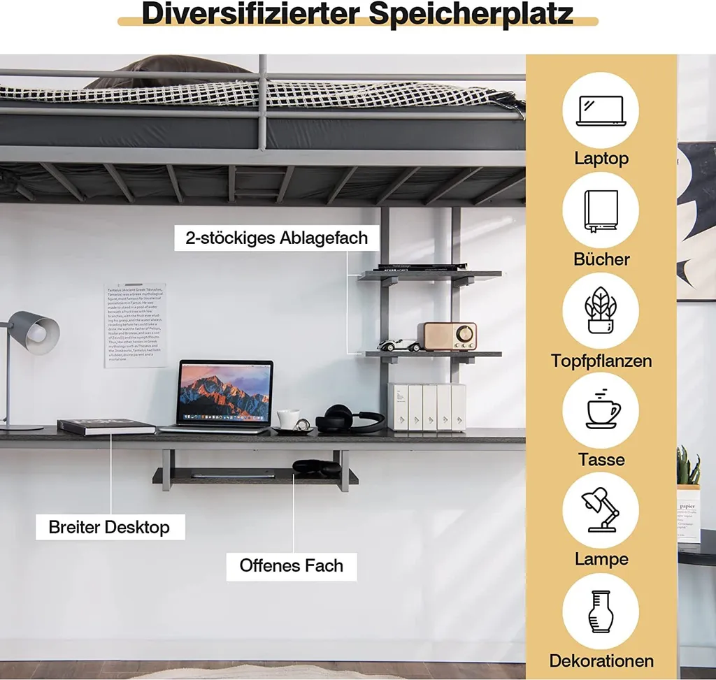 Dieses Hochbett aus Metall verfügt über einen Schreibtisch und zwei Regale, die viel Stauraum für Dinge des täglichen Bedarfs bieten und gleichzeitig einen gemütlichen Platz zum Arbeiten und Lernen schaffen. Darüber hinaus verbessert das Hochbett mit einem großzügigen Unterbettabstand die Raumnutzung und Sie können es in einen perfekten Arbeitsplatz, eine Leseecke oder eine Komfortzone verwandeln.