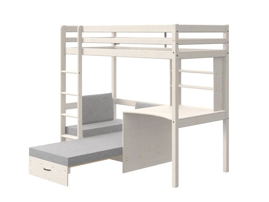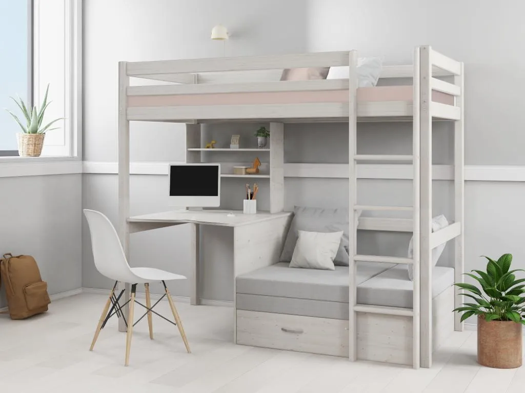 Ihr Kind wird begeistert sein, all seine Vorteile zu entdecken: Schreibtisch, Regale, Aufbewahrungsbox und ein Sofadas sich in ein Zusatzbett verwandeln lässt.