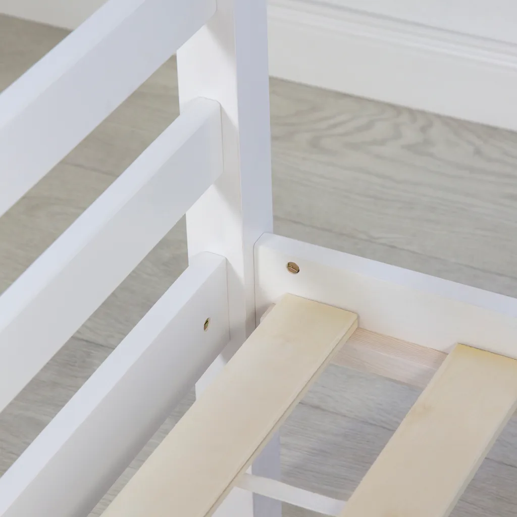 Schlafen, Spielen und Lernen. Mit diesem multifunktionalen, weißen Hochbett schaffen Sie ein Spiel- und Schlafparadies im Kinder- oder Jugendzimmer. Ein Hochbett ist Teil von kleinen Abenteuern und Fantasiespielen und bietet durch seine Konstruktion viel Platz und Stauraum im Zimmer. Mit einer Liegefläche von 90 x 200 cm besteht unter dem komfortablen, Bett mit einer Höhe von 144 cm viel Platz für die Spiel- oder Schreibecke. Die massiven Bettfüße sorgen für eine stabile Ausführung. Die integrierten Schubläden sind auf leichtgängigen Kunststoffrollen gelagert. Nach einem aufregenden Tag kann Ihr Kind in diesem Hochbett erholt und ruhig schlafen.