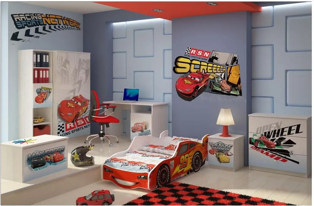 Das Kinderbett überzeugt mit einem einzigartigen Rennauto-Design in stylischem Racing-Car-Motiven, fröhlichen Kinderfarben und sicheren Konstruktion. Der solide Rahmen und flexible Lattenrost halten eine Belastung bis 100 kg aus.