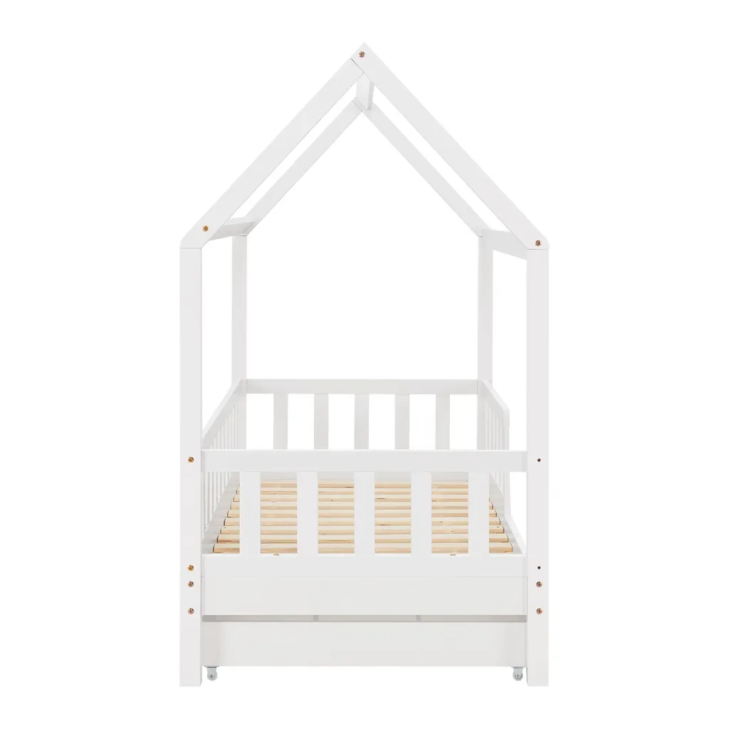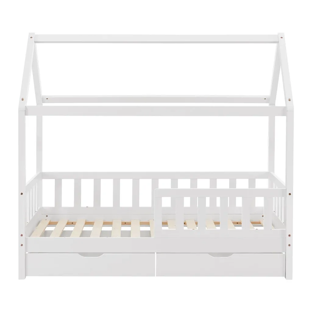 Das Kinderbett Marli (160×80 cm, Weiß) mit Bettkasten, Rausfallschutz und Lattenrost überzeugt Mädchen und Jungen von 3 bis 10 Jahren. Verschönern Sie das Kinderzimmer mit dem modernen Hausbett, das Schlafplatz, Spielbett und Stauraum in einem ist. Spielzeug & Co. verstauen Sie ordentlich in dem großen 2-teiligen Bettkasten. Und die Hausoptik mit Dach bietet viele Möglichkeiten zur Gestaltung – als Höhle oder mit bezaubernder Himmeldekoration. Ausgestattet mit einem Gitter, bietet das Bett für junge Kinder zudem mehr Schutz und Sicherheit. Für einen langen Einsatz ist das Holzbett aus massivem und pflegeleichtem Kiefernholz die richtige Wahl.