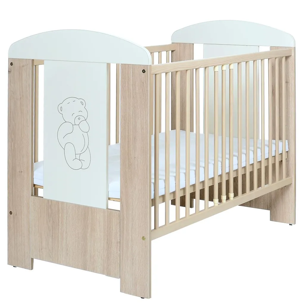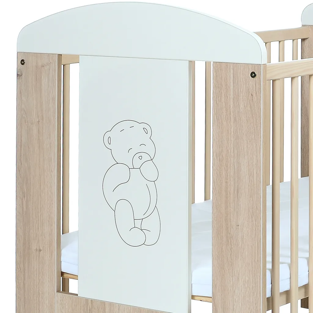Das Kinderbett Bär 120×60 cm aus Kiefernholz mit Schaumstoffmatratze für Mädchen und Jungs bereits ab Geburt mit einer schönen ins Holz eingravierten Bären in einem der beiden Bett Frontelemente. Die Konstruktion und das verwendete Holz verleihen dem Bett eine sichere Stabilität und sorgen für einen langen Produktlebenszyklus. Eine Schaumstoffmatratze mit den Abmessungen 120x60x5 ist im Lieferumfang enthalten. Eine Wickelunterlage im Design „Bär“ passend zu der Kommode können Sie bei uns auch erwerben. Siehe andere Artikel von LCP Kids.