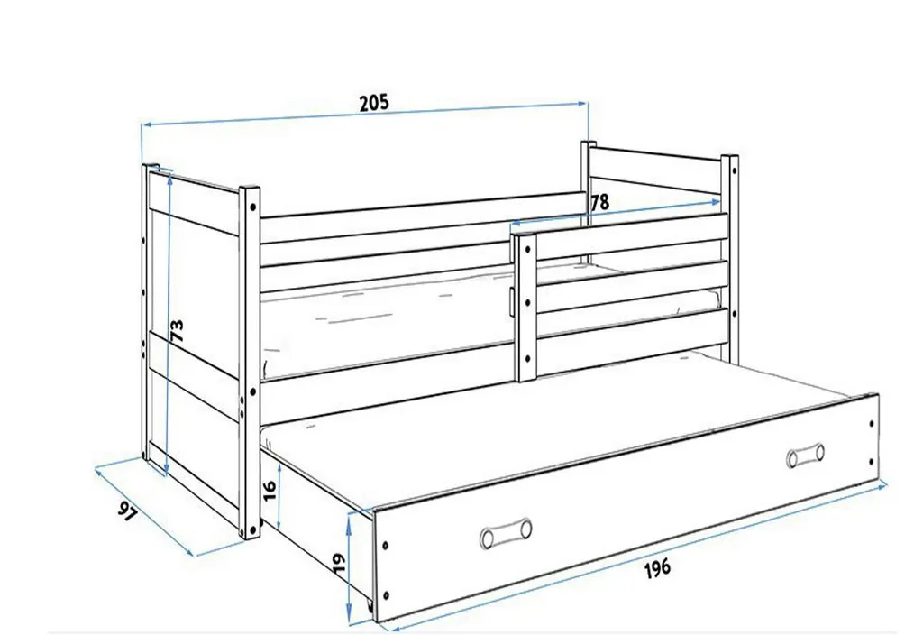 Das FIONA P2 Kinderbett hat einen Bettrahmen, der aus festem Kiefernholz in Kombination mit Laminat entwickelt ist. Die Stabilität und Festigkeit des Bettes ist so gesichert. Die Kopfteile aus Qualitätslaminat sind durch eine Sicherheitsschicht gegen Beschädigung behandelt. Komfort ist dank der PUR-Schaummatratze mit antiallergenem abnehmbarem Bezug und dem FLEX Lattenrost besorgt. Der Lattenrost besteht aus fegrigen Lamellen, die wir dazu liefern. Im unteren Teil finden Sie eine Aufbettung. Farbdekore zur Wahl.