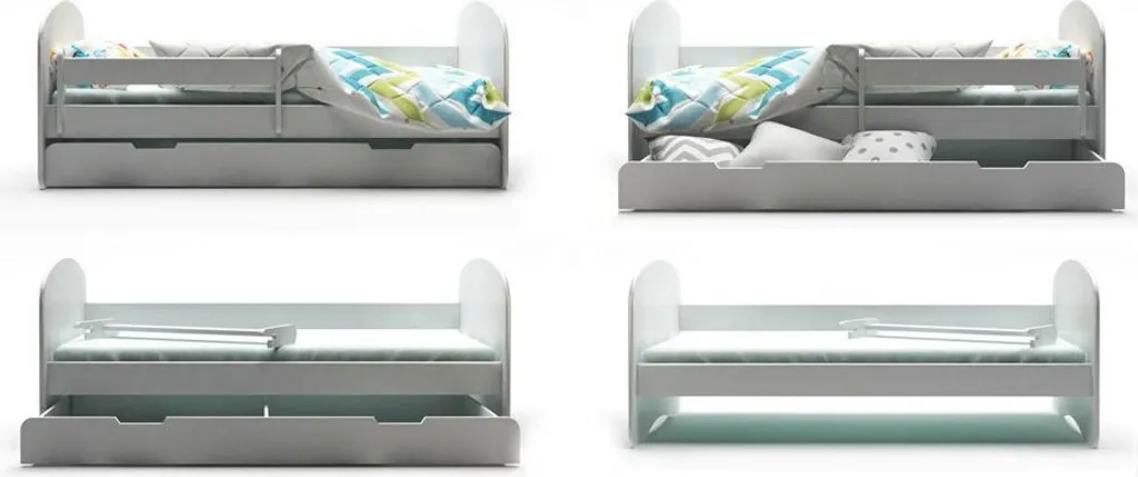 - hat ein verschiebbares und abnehmbares Geländer, um das Kind vor dem Herausfallen auf den Boden zu schützen