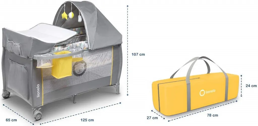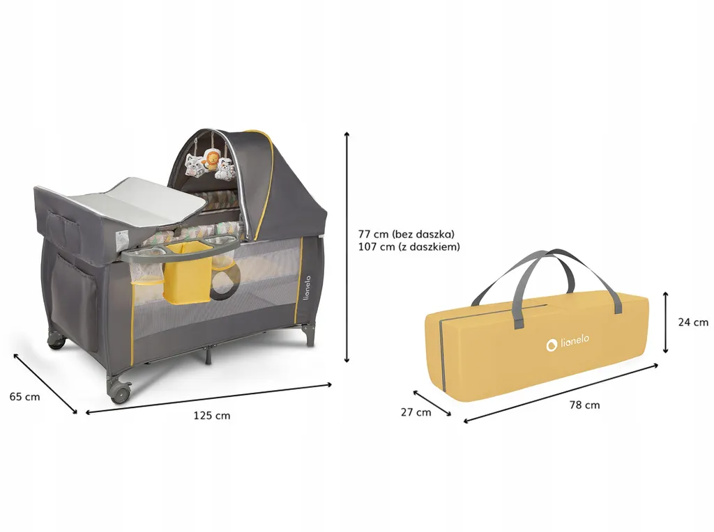 Kinder Reisebett Sven Plus von lionelo in GELB mit Wickelauflage, Musikbox, Ablage, Sonnenschutz, Moskitonetz und Reisetasche