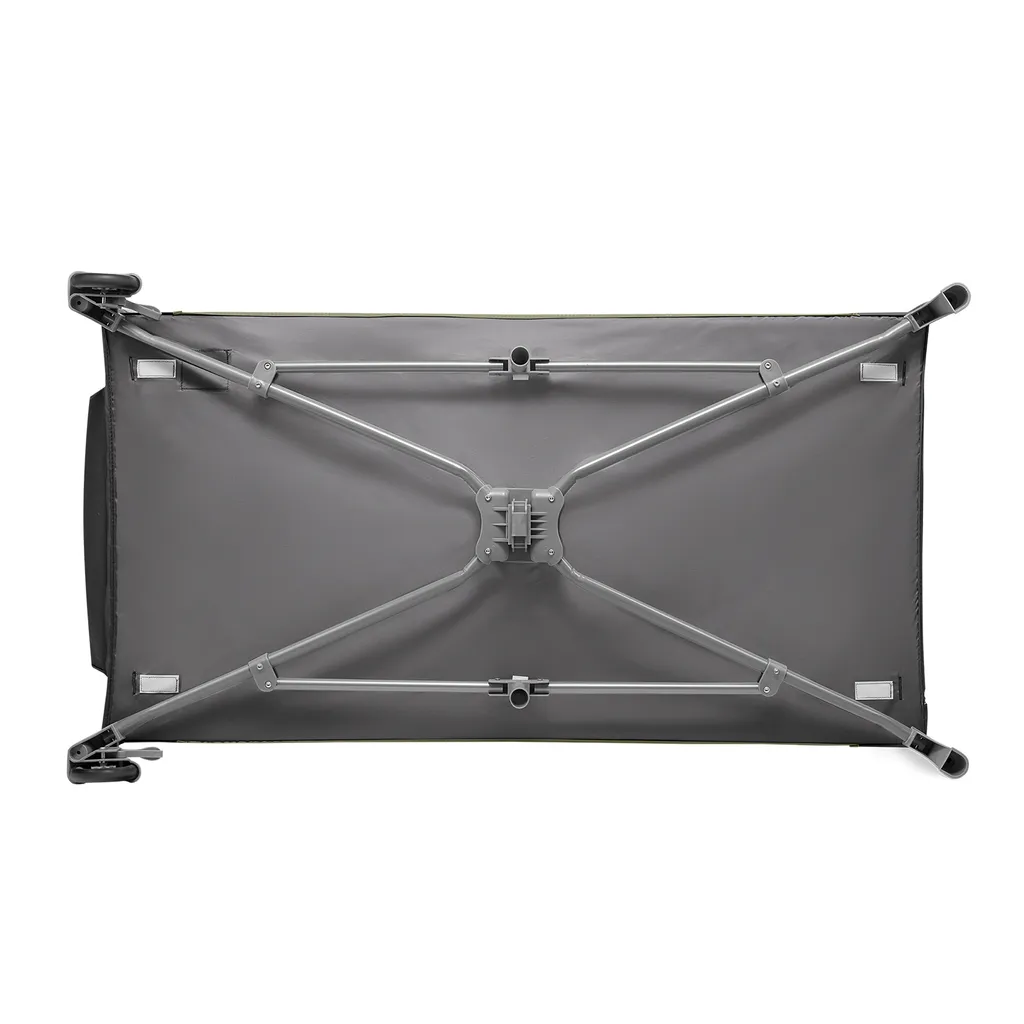 Ein an das Produkt angepasster, solider Transportüberzug ermöglicht einen einfachen Transport des zusammengefalteten Betts. Die Tasche bewährt sich unter allen Bedingungen.