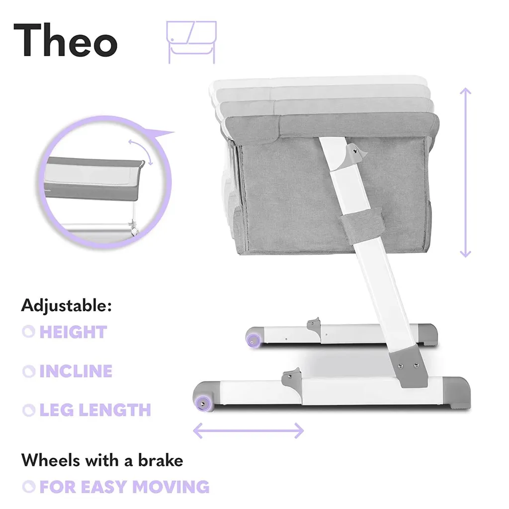 Das Kinderbett Theo kann auf bis zu 5 verschiedene Höhen eingestellt werden und kann sich dadurch an jedes Bett anpassen. Die Füße sowie die Neigung des Bettes können ebenfalls verstellt werden. Die Seite kann durch Reisverschlüsse geöffnet werden und ermöglicht so den direkten Kontakt zwischen Eltern und Kind.