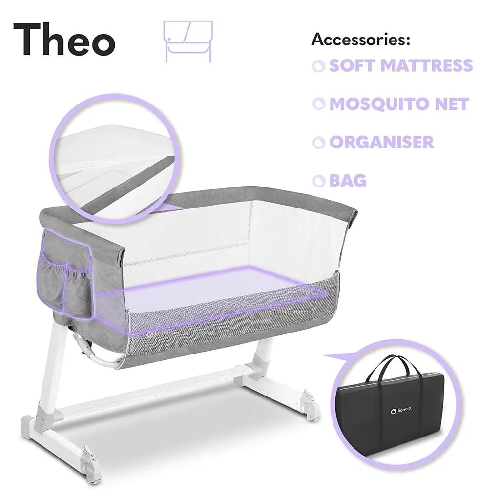 Lionelo Beistell- Babybett Theo in grau mit Matratze, Moskitonetz, Organizer und Tasche