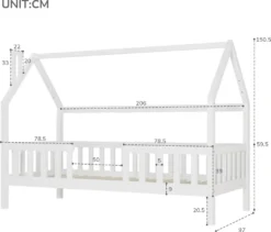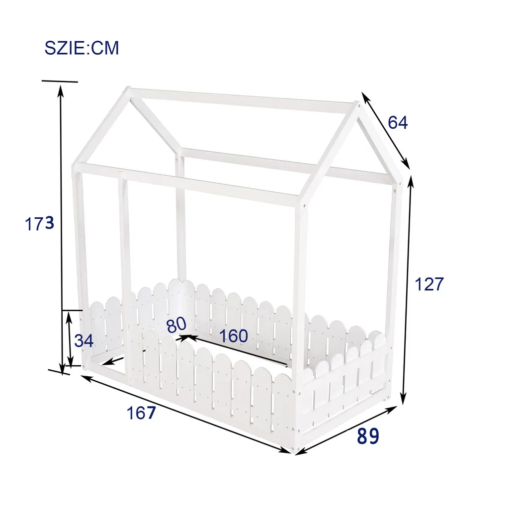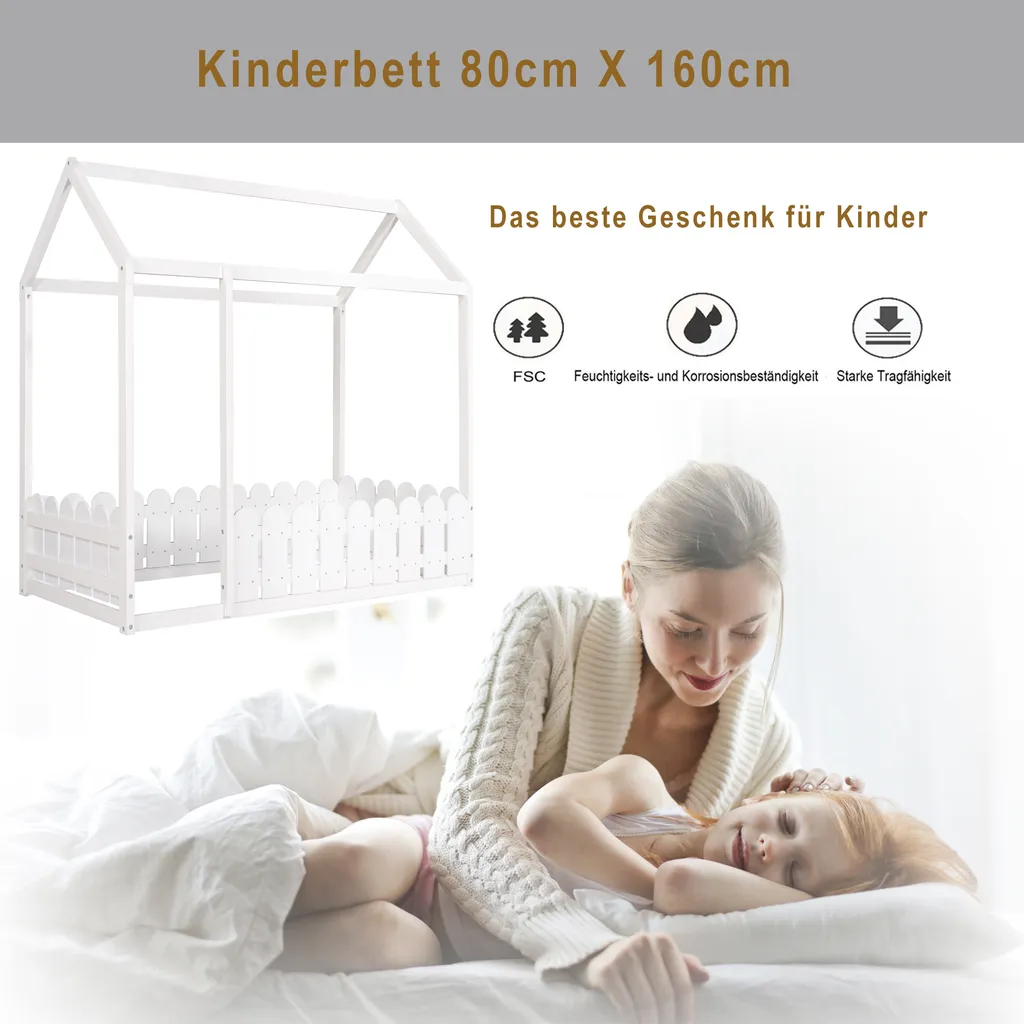 Merax Kinderbett 80x160cm Hausbett Mit Dach Und Zaun, Spielbett Einzelbett Aus Massivem Kiefernholz, Weiß