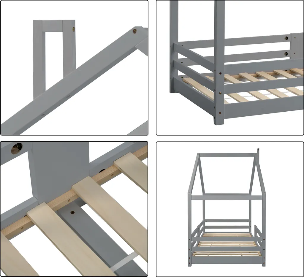 ????【Leichte Installation】Mit bebilderter Montageanleitung wird es leicht gebaut, Ihr Kinder kann schnell den Fröhlichkeit des Produkts genießen. Gesamtabmessung: 206 x 96 x 154 cm (L x B x H), Lieferumfang enthältet: 1x Hausbett, 1x bebilderte Anleitung, nötigte Montagewerkzeuge.