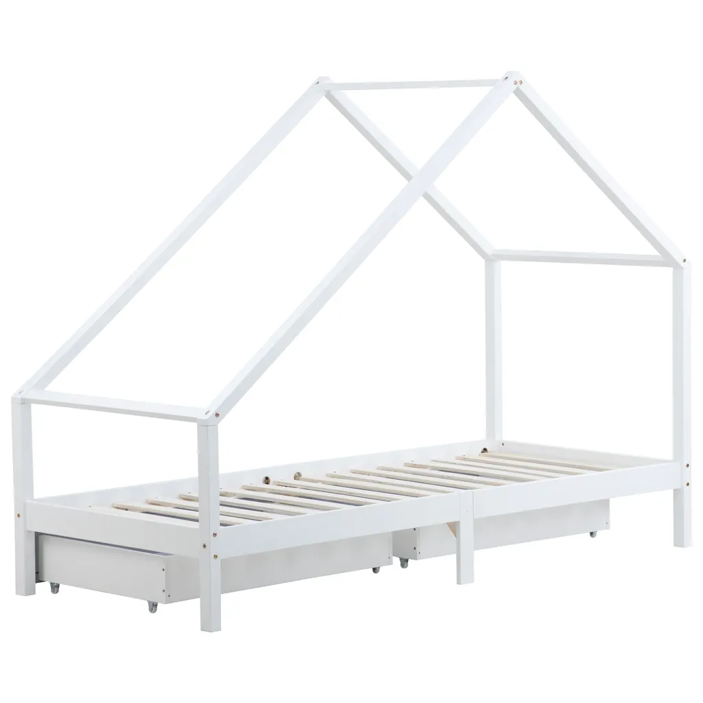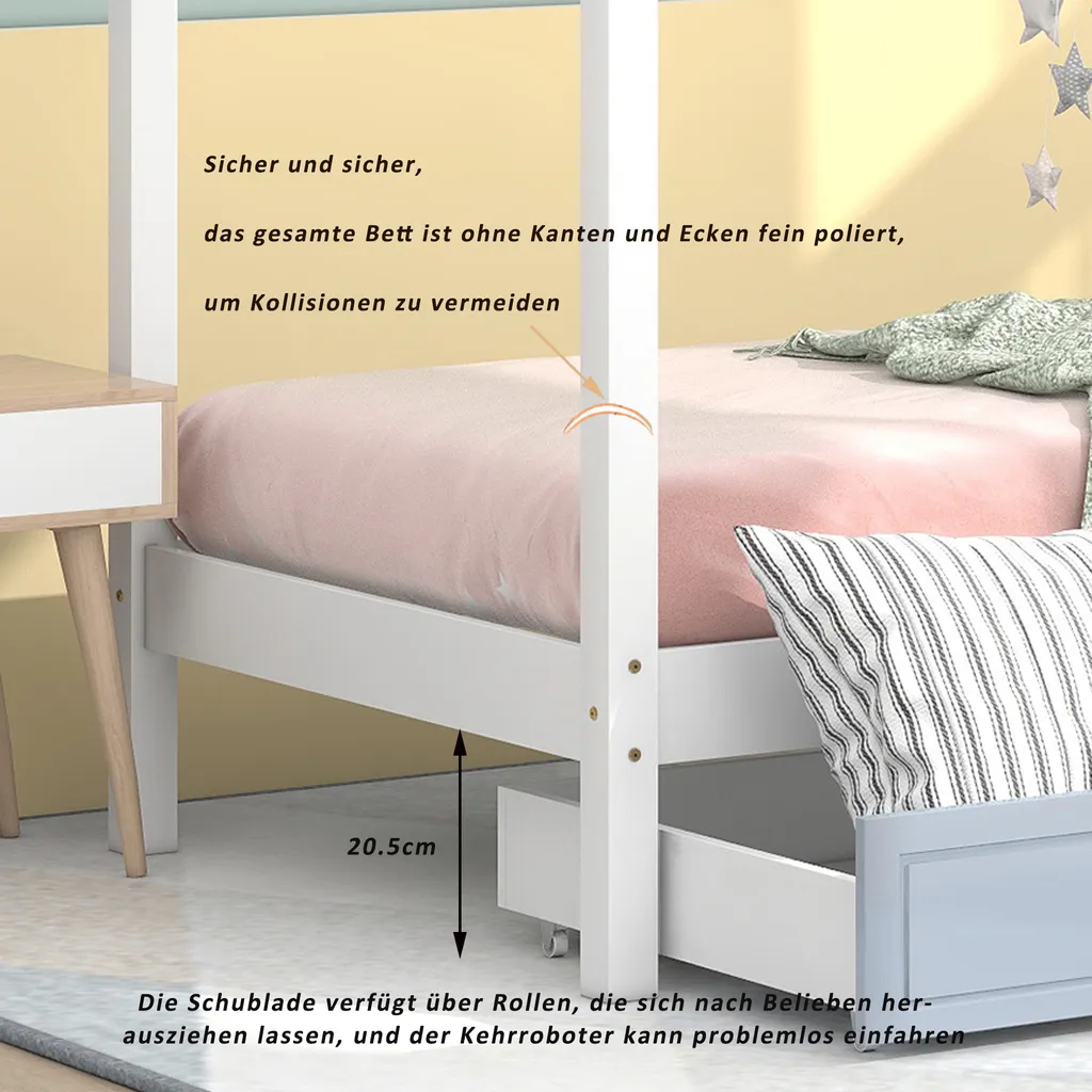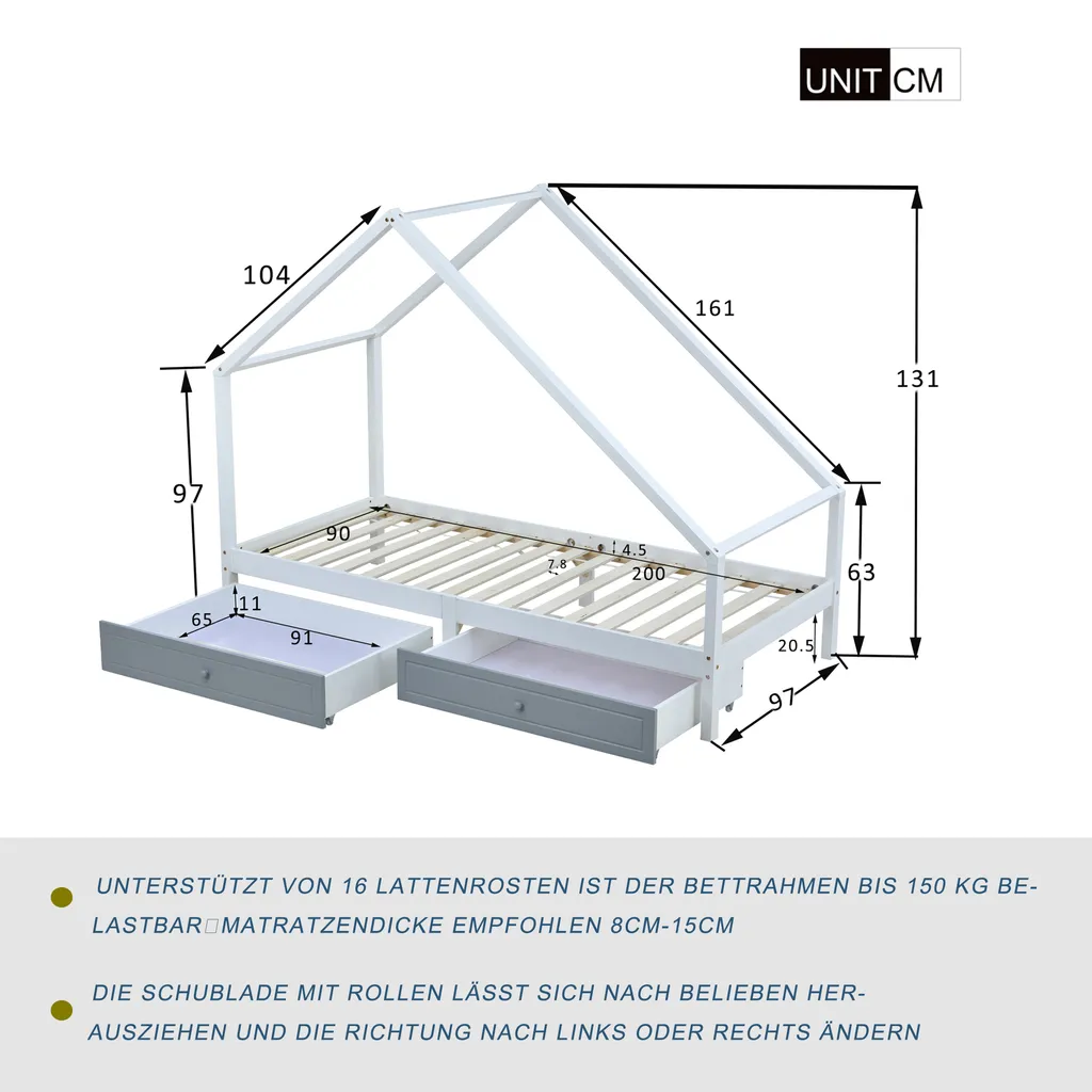 Dieses supercoole Heimbett ist perfekt für Kinder. Sie können den perfekten Raum im Schlafzimmer schaffen, um der Fantasie Ihres Kindes freien Lauf zu lassen. Dank seines vielseitigen und schlichten Gestells können Sie es ganz nach der Persönlichkeit Ihres Kindes dekorieren, zum Beispiel mit drapierten Stoffen, hängenden Laternen oder Spielzeug. Dieses Holzbett ist auch perfekt für die Leseecke oder das Spielzimmer Ihres Kindes. Dieser Bettrahmen aus massivem Kiefernholz ist sehr stark und langlebig. Zwei große Schubladen zur Aufbewahrung erleichtern die Organisation Ihres Zimmers, bitte beachten Sie: Die Lieferung umfasst nur das Bettgestell, zwei Schubladen, Montageanleitung und Werkzeug, die Matratze ist nicht enthalten.