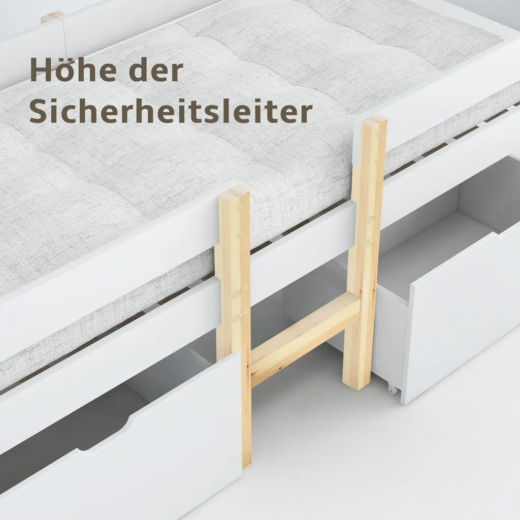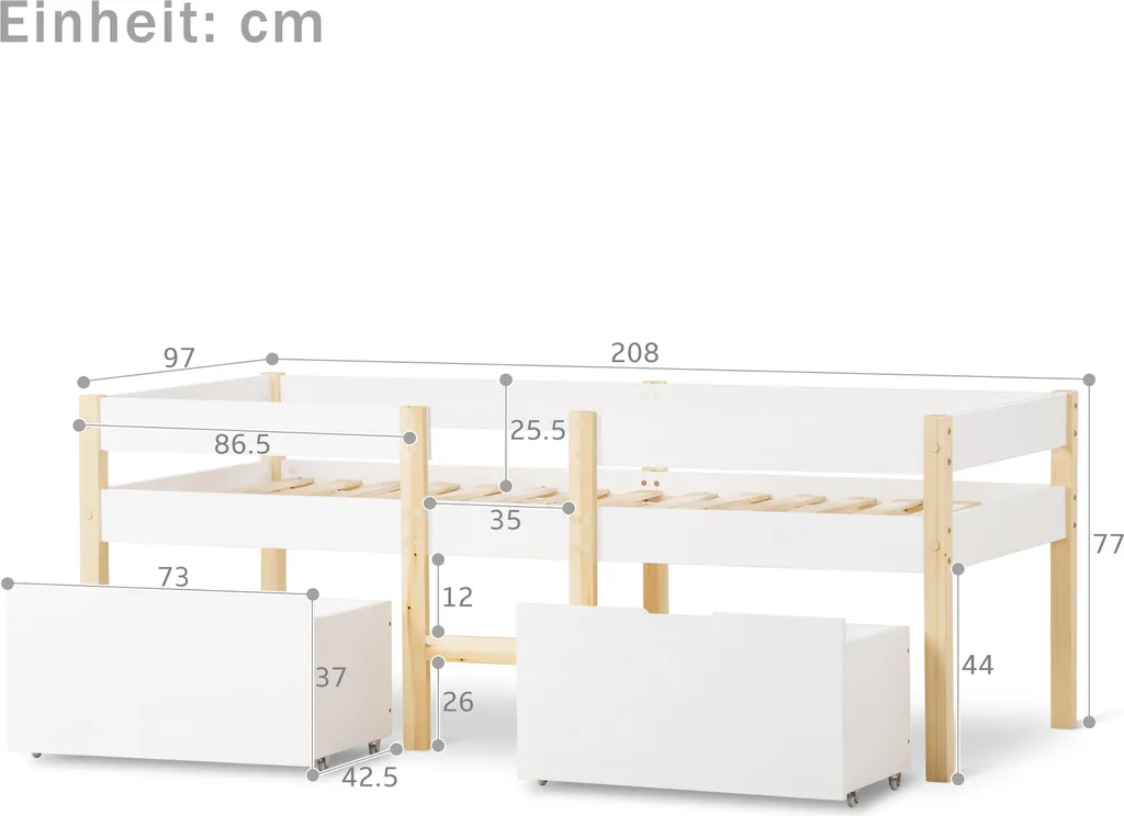 - ????MIT SCHUBLADE & LATTENROST: Die Tiefe der Schublade beträgt 30 cm. Die Schublade bietet Extra-Stauraum für Bettdecken, Kissen oder Spielzeuge. Die Schubladen sind mit Laufrollen ausgestattet und lassen sich leicht herausziehen. Schubkasten-Innenmaß: H30/B64/T38 cm