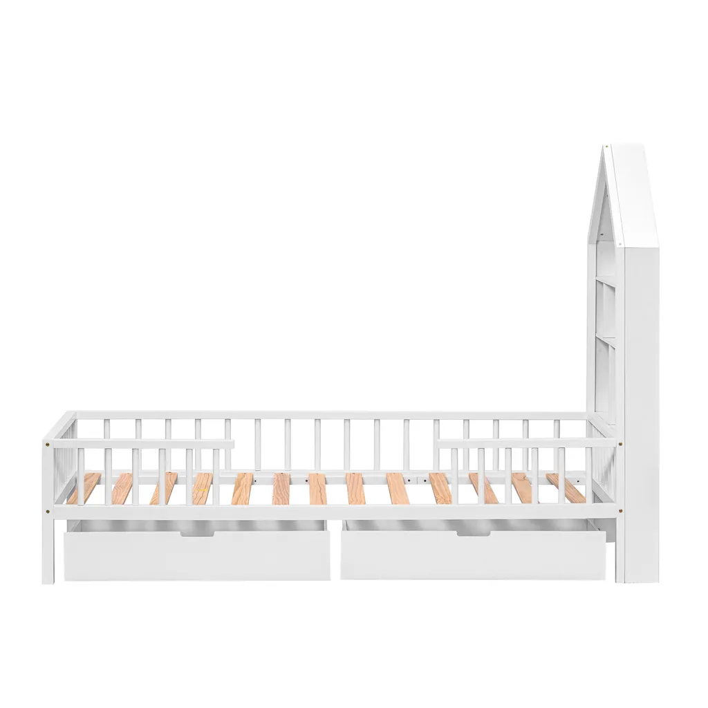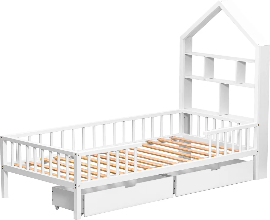 ????【Viel Stauraum】Die zwei Designs dieses Bücherregal-Kinderbetts bieten viel Stauraum. Zum einen das Bücherregal am Kopfende dieses Kinderbettes und zum anderen die beiden großen Schubladen unter den Lattenrosten. Das Bücherregal kann als Ort für den täglichen Gebrauch genutzt werden. Die beiden großen Schubladen bieten Platz für Bettwäsche, Kleidung für die Saison, Bücher und Spielzeug, das nicht benutzt wird, und so weiter. Diese Konfiguration macht den Raum sauberer und aufgeräumter.