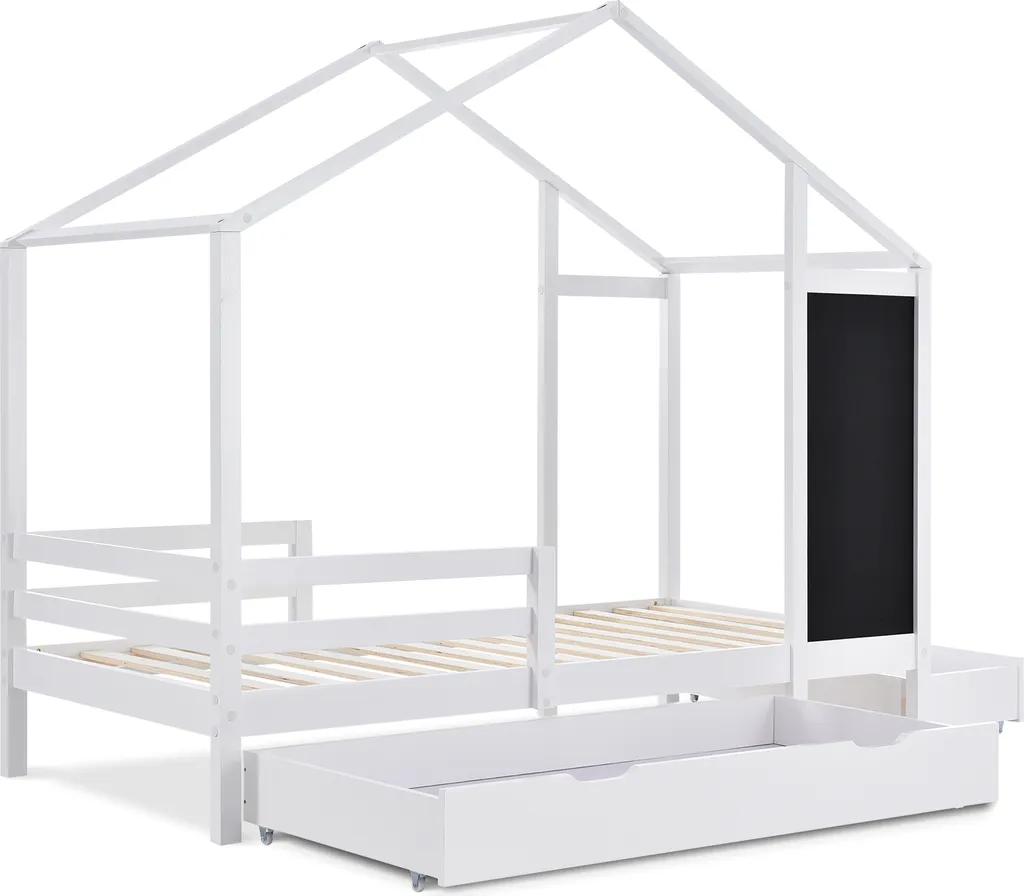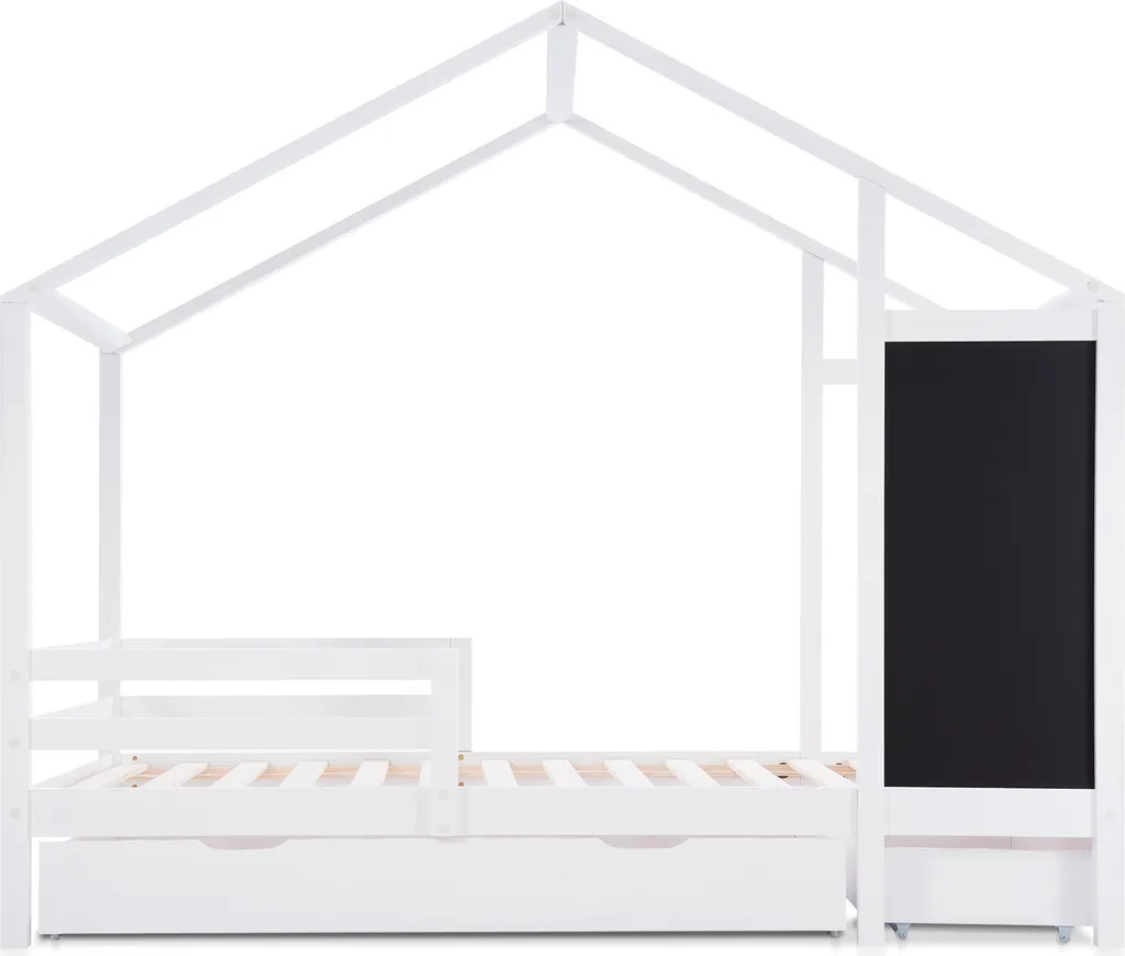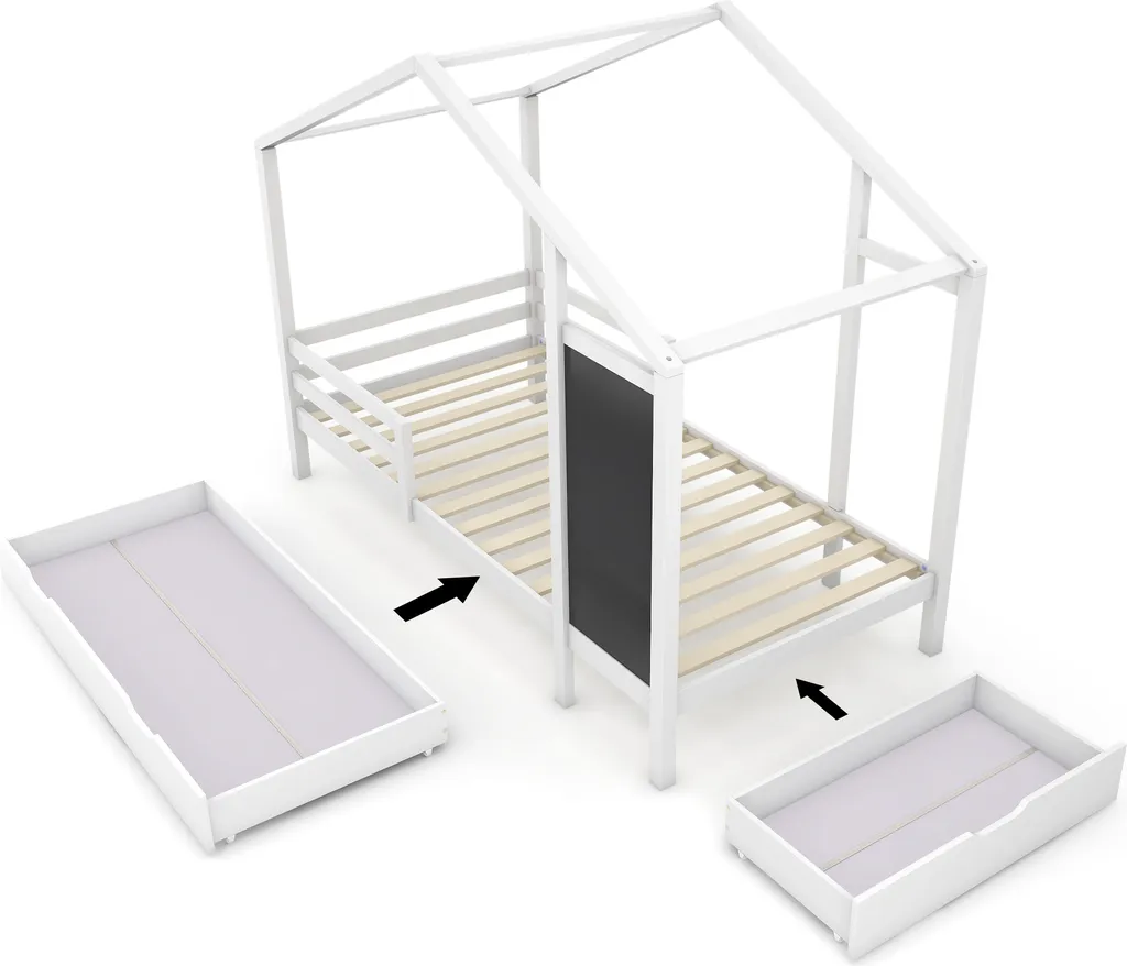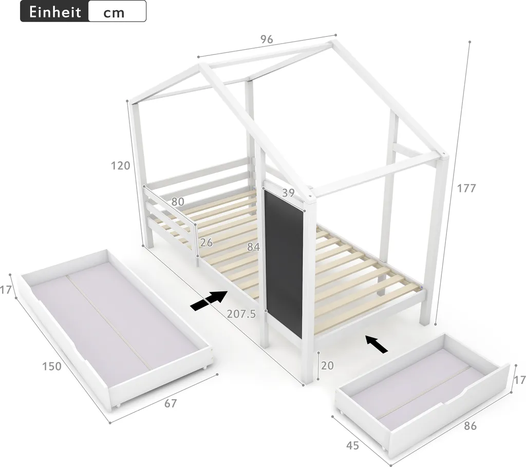 ????【Vielfältige Lagerungsfunktionen】Die Vorder- und Seite des Bettes sind mit Schubladen mit unterschiedlichem Stauvolumen ausgestattet.Die Größe der großen vorderen Schublade beträgt 150x67x17 cm,in der große Gegenstände wie Decken oder Kinderschlafpuppen aufbewahrt werden können. Die Größe der seitliche Schublade beträgt 86 x 45 x 17 cm und kann einige Zeichenkreide aufbewahren.