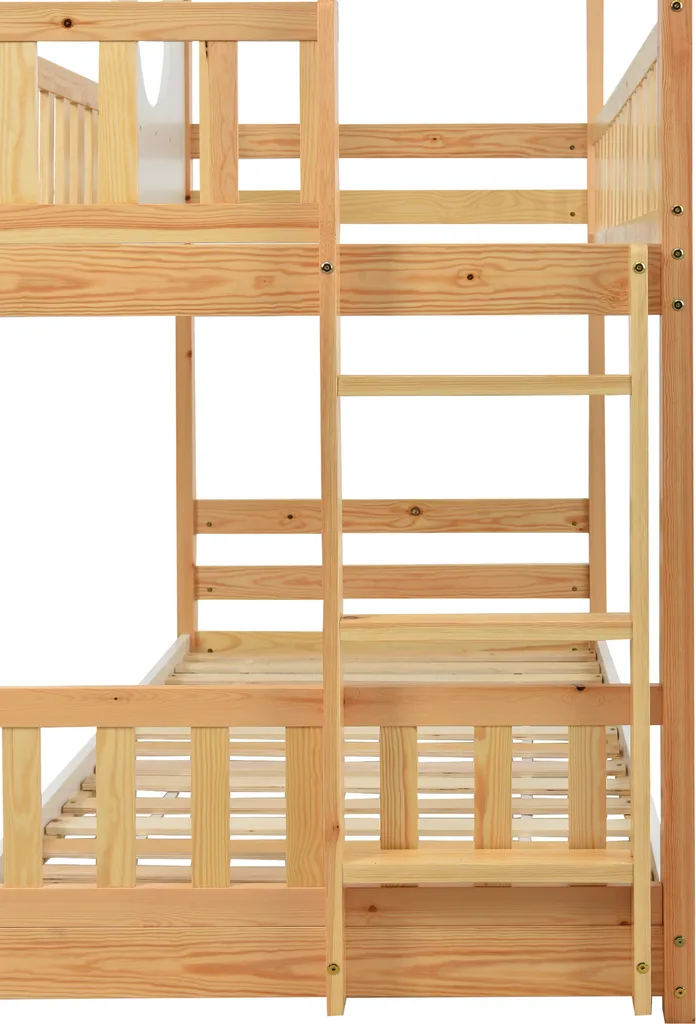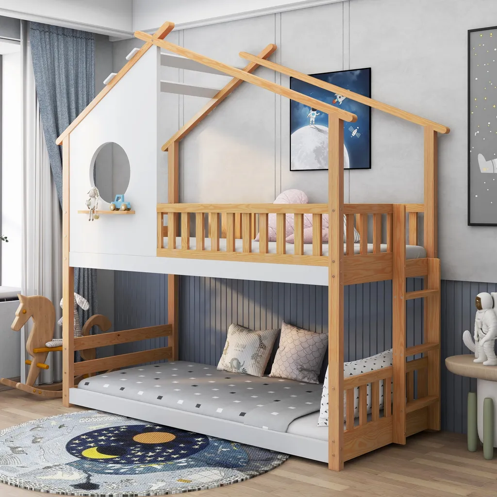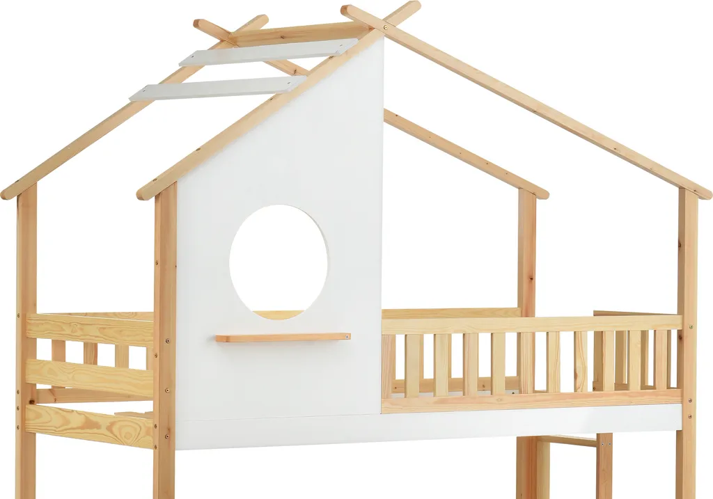 ????【Einzigartige Farbabstimmung】Der gesamte Rahmen des Bettes ist in klassischer Naturfarbe gehalten, die Balken auf der Bettoberseite, die Fensterpaneele und die Seitenteile des Bettes sind in frischem Weiß gehalten. Die Kombination der beiden Farben ist harmonisch und charaktervoll.