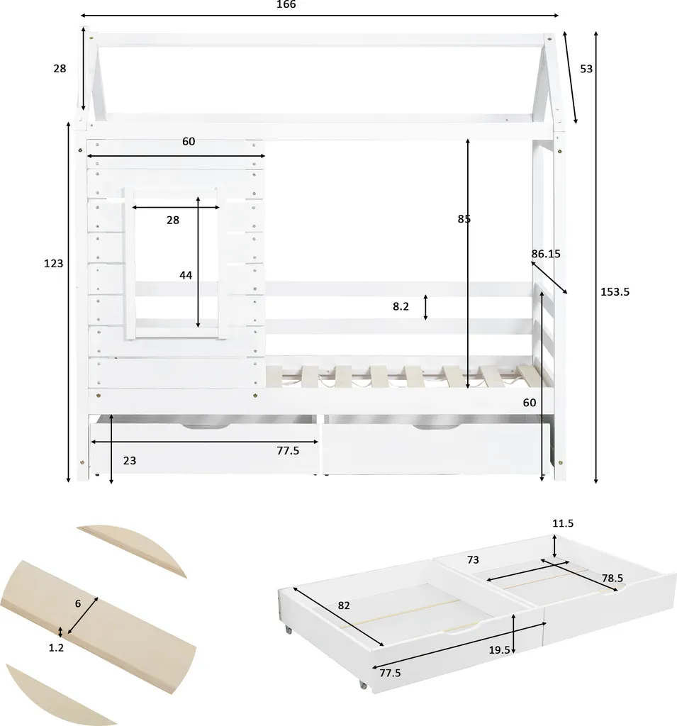 ????【Großer zweiteiliger Bettkasten & Großer Stauraum】 Zwei 77,5 x 82 x 19,5 cm große Schubladen bieten ausreichend Stauraum für Bettlaken, Spielzeug und Kleidung. Der geräumige Kasten mit Rollen und integrierten Griffen lässt sich leicht öffnen oder bietet unten genug Platz zum Staubsaugen. Die Größe des Bettes ist auch für kleine Räume geeignet.