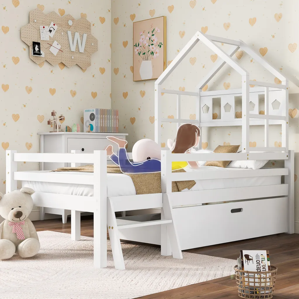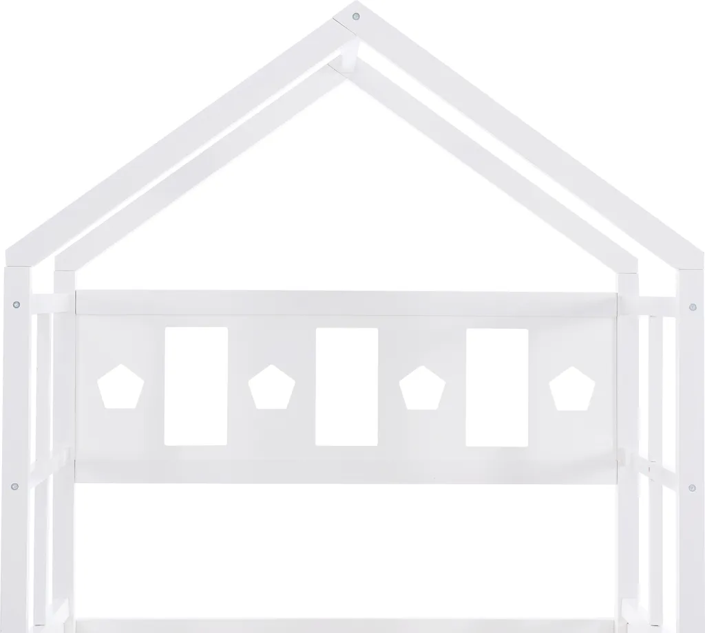 ????【Schicker Stil Hochbett】Dieses Bett vereint die Vorteile einer Waldhütte und eines Hochbettes mit einer einzigartigen Form, zwei Seiten sind Fenstergitterformen und eine Seite ist hohle geometrische Muster. Der 28 cm hohe Zaun an allen Seiten macht den Schlaf der Kinder nachts sicherer.