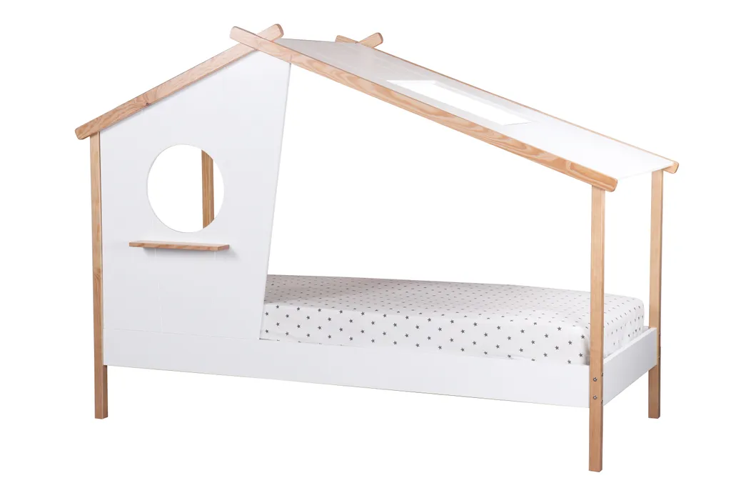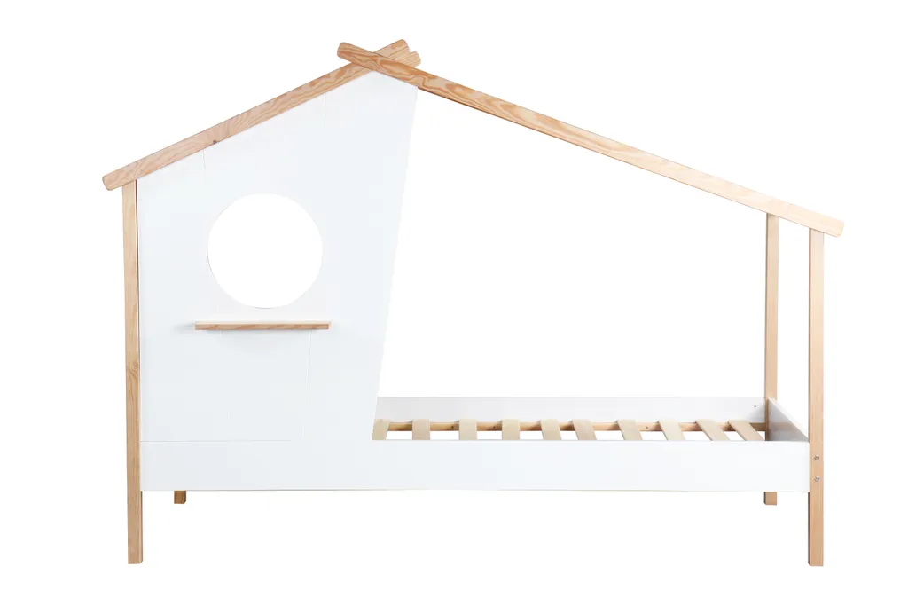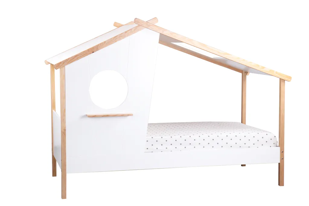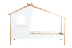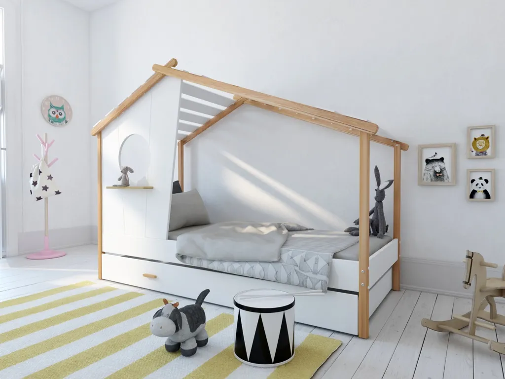Dass es in punkto Einrichtung für das Kinderzimmer auch ausgefallen geht, beweist dieses Bett. Schönes Design und die nordisch-moderne Farbkombination von weiß lackiertem Korpus und naturbelassenem Holz machen das Kinderbett zum modernen Hingucker. Die hausförmige Basis mit viel offener Fläche bietet jede Menge Platz zum Spielen und Schlafen. Durch das Anbringen von Stoffen oder Vorhängen an den Holzstreben kann das Bett im Handumdrehen personalisiert werden. Das Lattenrost für eine Matratzengröße von 90×200 cm ist im Lieferumfang enthalten. Lassen Sie der Fantasie Ihres Kindes freien Lauf und lassen Sie das Kinderbett vom sicheren Schlafplatz zum Ort für Spiel und Abenteuer werden. Das Bett besteht aus pflegeleichtem MDF und Pinienholz und bietet mit seiner skandinavisch schlichten Eleganz eine moderne Unisex Lösung für ein breites Spektrum an Kinderzimmereinrichtung und Altersstufen. Ob als Spielhaus oder Kuschelecke, dieses Möbelstück wird bestimmt zum neuen Lieblingsplatz Ihres Sprösslings.