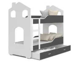 FURNIX Etagenbett In Hausform DERSI 80×160 Mit Schublade Und Matratzen Weiß-Grau
