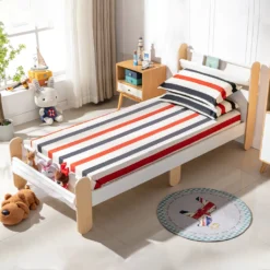 HOMCOM Kinderbett Jugendbett Hausbett Mit Betttasche Spielzeugtasche Ab 3 Jahre Holzbett Kinderzimmer Spielbett Einzelbett Kiefernholz Weiß+Natur 229 X 98 X 95 Cm