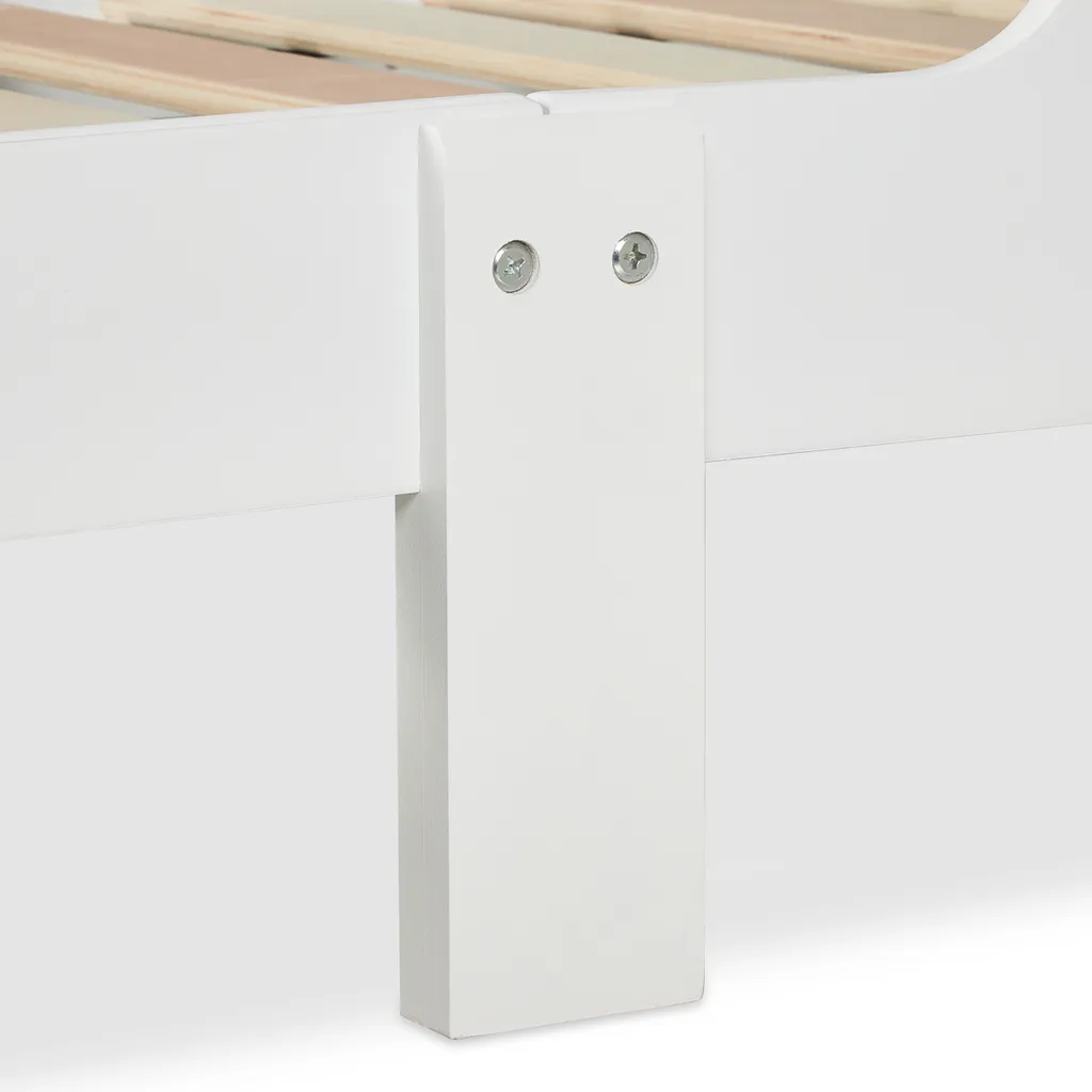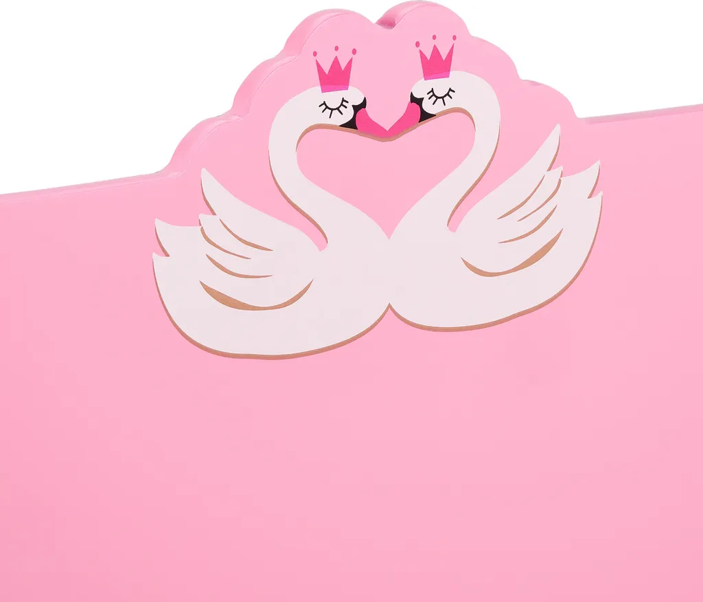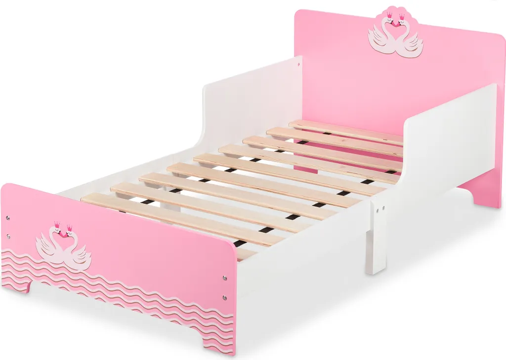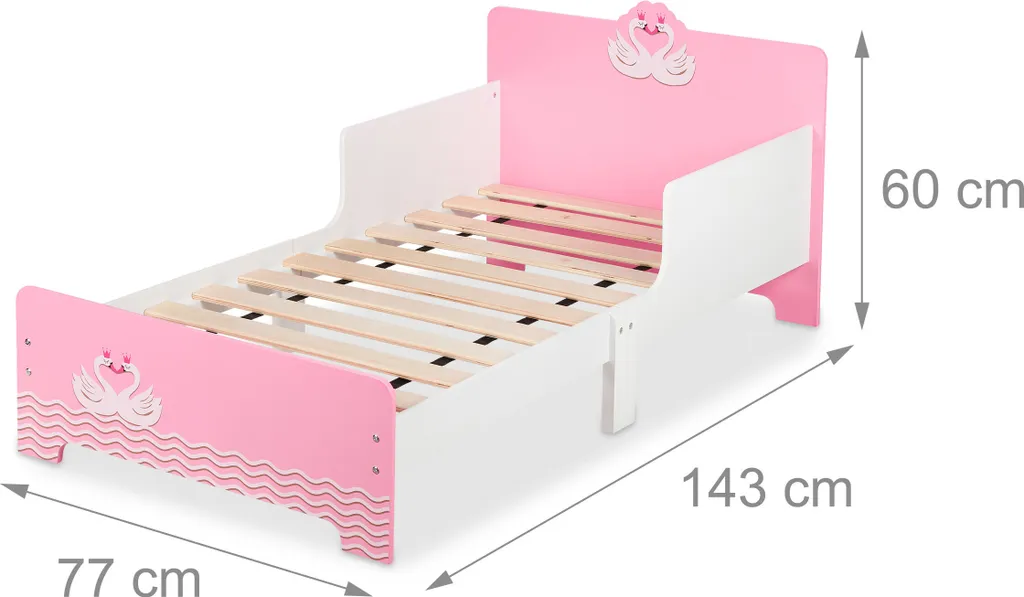 Dieses Kleinkinderbett ist ideal für den Wechsel in ein richtiges Bett. Dank der kindgerechten Höhe können bereits Kleinkinder eigenständig in das Kinderbett ein- und aussteigen. Erhöhte Seitenwände am Juniorbett sorgen für sicheren Schlaf durch einen entsprechenden Rausfallschutz, während abgerundete Kanten Schutz vor Verletzungen bieten. Das dekorative Design mit niedlichem Schwan-Motiv macht das Kinderbettgestell zu einem Blickfang im Kinderzimmer. Das Kinder-Einzelbett ist schnell aufgebaut.