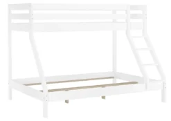 Praktisches Etagenbett mit 2 Schlafgelegenheiten übereinander und einer zusätzlichen Bettschublade. Das spart viel Platz im Kinderzimmer und bringt zusätzlich Stauraum. Es ist aus massiver Buche in Ausführung weiß lackiert. Die Liegefläche oben ist jeweils 90 x 200 cm und unten 140 x 200 cm.Die beiden Rolllattenroste sowie die Leiter sind im Lieferumfang enthalten. Die max. Matratzenhöhe für die obere LIegefläche ist 19 cm, die Einlegetiefe für das untere Bett beträgt ca. 5 cm. Das Kopf- und Fußteil ist jeweils in Sprossenoptik. Der hohe umlaufende Absturzschutz an der oberen Liegefläche bietet Sicherheit. Die Leiter ist links und rechts montierbar. Breite Trittstufen sorgen für sicheres Hinauf- und Hinabsteigen. Hochwertige Verarbeitung und sehr gute Stabilität zeichnen diesen Artikel aus. Die Pfostenstärke ist ca. 6,0 x 6,0 cm und der Abstand zwischen den Liegeflächen ist ca. 75 cm. Die Bettpfosten sind geteilt und das Bett kann später bei Bedarf zu zwei einzelnen Betten zurück gebaut werden. Somit bietet der Artikel eine zweifache Funktion. Die Bodenfreiheit beträgt ca. 22 cm. Die Bettschublade kann entweder als zusätzliche Liegefläche für eine 90 x 190 cm Matratze genutzt werden, oder man nutzt sie als zusätzlichen Stauraum für Kissen oder Decken. Der Artikel ist aus massiver Buche in natur lackiert. Die Bodenplatten sindNachbildung beschichtet. Die Bettschublade kann unter die Liegefläche geschoben werden. Griffmulden erleichtern das herausziehen der Bettschublade, die auf Rollen läuft. Der Artikel ist zerlegt, mit Aufbauanleitung zur einfachen Selbstmontage. Die Matratze, die Kissen und Dekomaterial gehören nicht zum Lieferumfang. Der Artikel ist für Kinder unter 6 Jahren nicht geeignet. Die benötigte Stellfläche ist ca. B: 209 x T: 151,6 cm. Die Höhe ist ca. 160 cm.