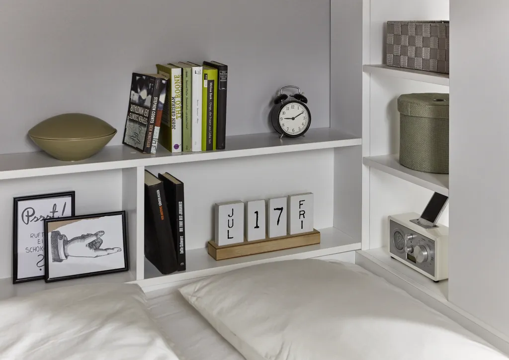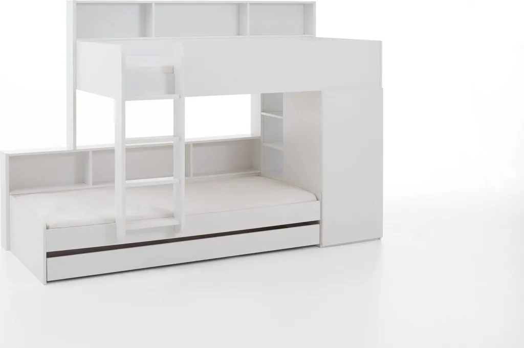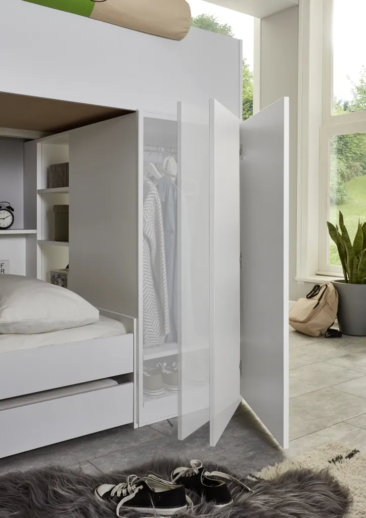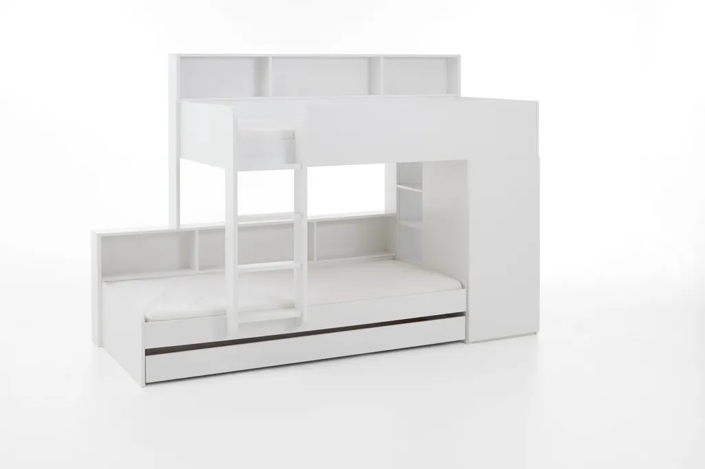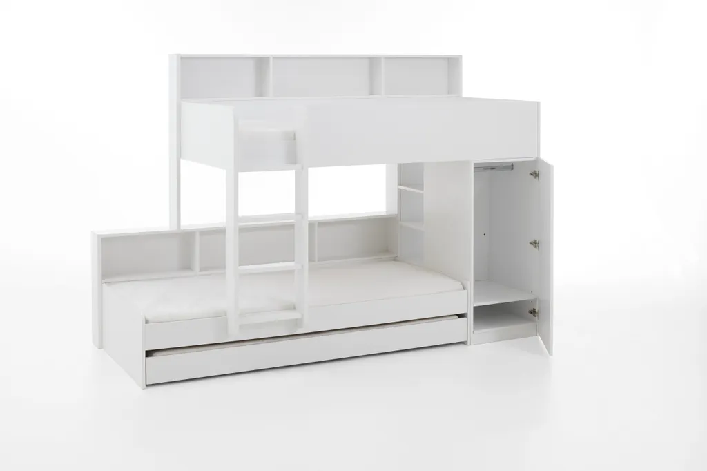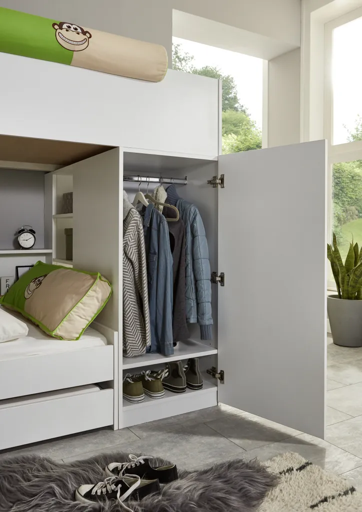 Tolles Etagenbett zum Schlafen und Spielen, mit 2 versetzten Schlafgelegenheiten übereinander. Besondere Funktionalität bieten die beiden Bücherregale an der Rückseite des Bettes, sowie der Kleiderschrank. Die Regale bieten viel Platz und Ablagemöglichkeiten für Bücher oder andere dekorative Gegenstände. Die Fachinnenmaße der Regale sind jeweils ca. B: 66,7 x H: 26,4 x T: 14,4 cm. Das Bett ist aus Spanplatte mit einer pflegeleichten Oberfläche in AusführungNachbildung Weiß. Die Liegefläche ist jeweils 90 x 200 cm. Die obere Liegefläche erreicht man über die Leiter (Trittabstand ca. 25 cm). Breite Trittstufen sorgen für sicheres Hinauf- und Hinabsteigen. Als Auflage für die Matrzaten dienen stabile Bodenplatten mit Lüftungslöchern sind im Lieferumfang enthalten. Sie dienen zusätzlich der Stabilität und Standfestigkeit des Bettes. Die obere Liegefläche hat einen umlaufenden Absturzschutz und die max. Matratzenhöhe ist ca. 15. cm. Der Abstand zwischen den Liegeflächen beträgt ca. 80 cm. Vom Boden bis zur Oberkante des Absturzschutzes sind es 151 cm, bis zu Oberkante des Regals ca. 181 cm. Der Kleiderschrank (Innenmaß ca.: B: 49 x T: 55 cm) ist mit einer Kleiderstange für Hängemöglichkeit und einem Boden ausgestattet. Zusätzlich gibt es hinter dem Schrank noch ein offenes Regal (ca.: B: 35 x T: 50 cm), was von beiden Seiten zugänglich ist. Der Mix aus 25 u. 18 mm starker Spanplatte, gibt dem Bett eine hervorragende Standfestigkeit. Das Bett ist hochwertig verarbeitet und zeichnet sich durch sehr gute Stabilität aus. Max. Belastbarkeit 80 kg pro Liegefläche. Die Bettschublade muss optional separat dazu bestellt werden, diese gehört nicht zum Lieferumfang. Die Matratze, die Kissen und Dekomaterial gehören nicht zum Lieferumfang. Benötigte Stellfläche ca: B: 258,6 x H: 181,2 x T: 111,1 cm. Die Ware ist zerlegt mit Aufbauanleitung, zur einfachen Selbstmontage. Gebaut nach HRN EN747 1/2: 2015.
