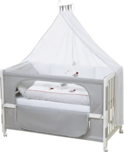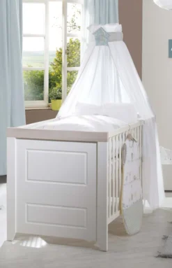 Das roba Kinder-Kombibett ‚Nele‘ hat weiße Fronten mit horizontalen Fräsungen und eine Leiste imNachbildung ‚Artisan Eiche‘. Die Liegefläche des Bettes beträgt 70 x 140 cm. Für ein leichtes Aus- und Einsteigen können 3 Schlupfsprossen herausgenommen werden. Die Liegefläche ist höhenverstellbar und lässt sich in 3 unterschiedlichen Positionen befestigen. Mit zusätzlich erhältlichen Umbauseiten lässt sich das Gitterbett ganz einfach in ein Juniorbett verwandeln. Maße des Babybettes: HxBxT: 80,5 x 76 x 144 cm. Alle verwendeten Materialien sind . Alle Oberflächen sind abwischbar und pflegeleicht. Wahlweise ist separat auch ein passender Bettkasten zum Einschub unter das Bettchen erhältlich, sowie viele weitere passende Möbel wie Wickelkommode, Schrank und Wandregal der Serie ‚Nele‘.