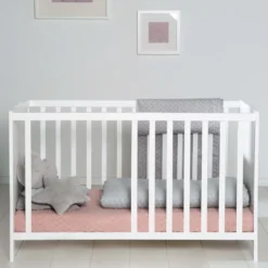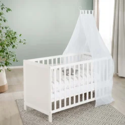 Verwendbar als Beistellbett zum Elternbett, Stubenbett und Kinderbett mit Stoffwand oder mit Seitengittern. Das Anstellbett lässt sich mit den mitgelieferten verstellbaren Metallwinkel leicht und sicher am Elternbett einhängen und kann nicht verrutschen. Die Liegefläche des Room Beds 60 x 120 cm, lässt sich 6-stufig optimal auf die Höhe der Elternmatratze einstellen. Mit den mitgelieferten Rollen wird es zum mobilen Stubenwagen oder Babybett. Im Lieferumfang enthalten sind Bettwäsche (Kissen 40×60 cm, Decke 100×135 cm), Himmel inkl. -stange, Matratze und Bremsrollenset, ein weiteres Seitengitter aus Holz und eine Bettseite mit Stoffwandung, die durch einen Reißverschluss geöffnet werden kann. Das roba Room Bed eignet sich von Geburt an und kann durch die Umbaubarkeit und die Höhenverstellung des Lattenrost bis zum Umstieg auf ein großes Bett verwendet werden. Der Lack ist lebensmittelecht und hautverträglich. Kollektion ‚Little Stars‘