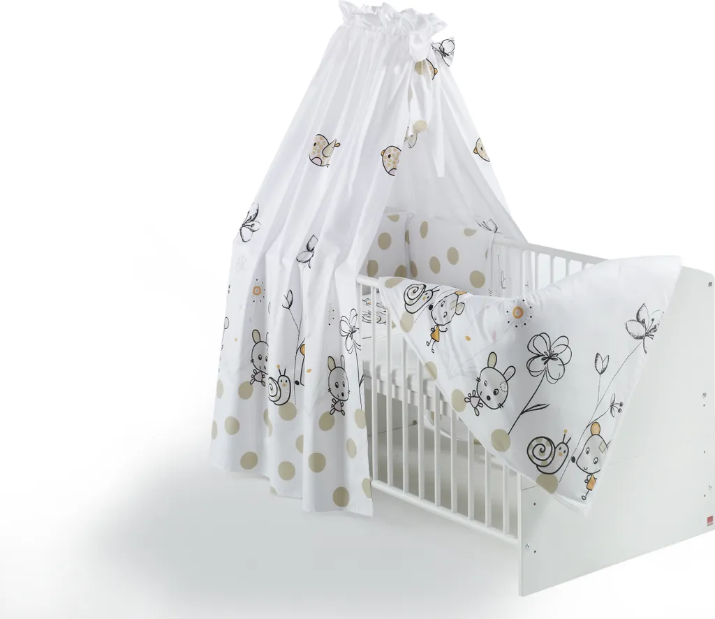Kombi-Kinderbett Classic Line weiß 70×140 cm, Rundholmgitter Buche massiv weiß lackiert, 2 Schlupfstäbe, Rost 2-fach verstellbar, zum Juniorbett umbaubar. Außerdem ist im Lieferumfang folgendes enthalten: eine Matratze 70×140 cm, eine Himmelstange und ein 4-teilges Bettset Capucine – bestehend aus einem Kissen (40×60 cm), einer Zudecke (135×100 cm), Himmel und Nestchen.