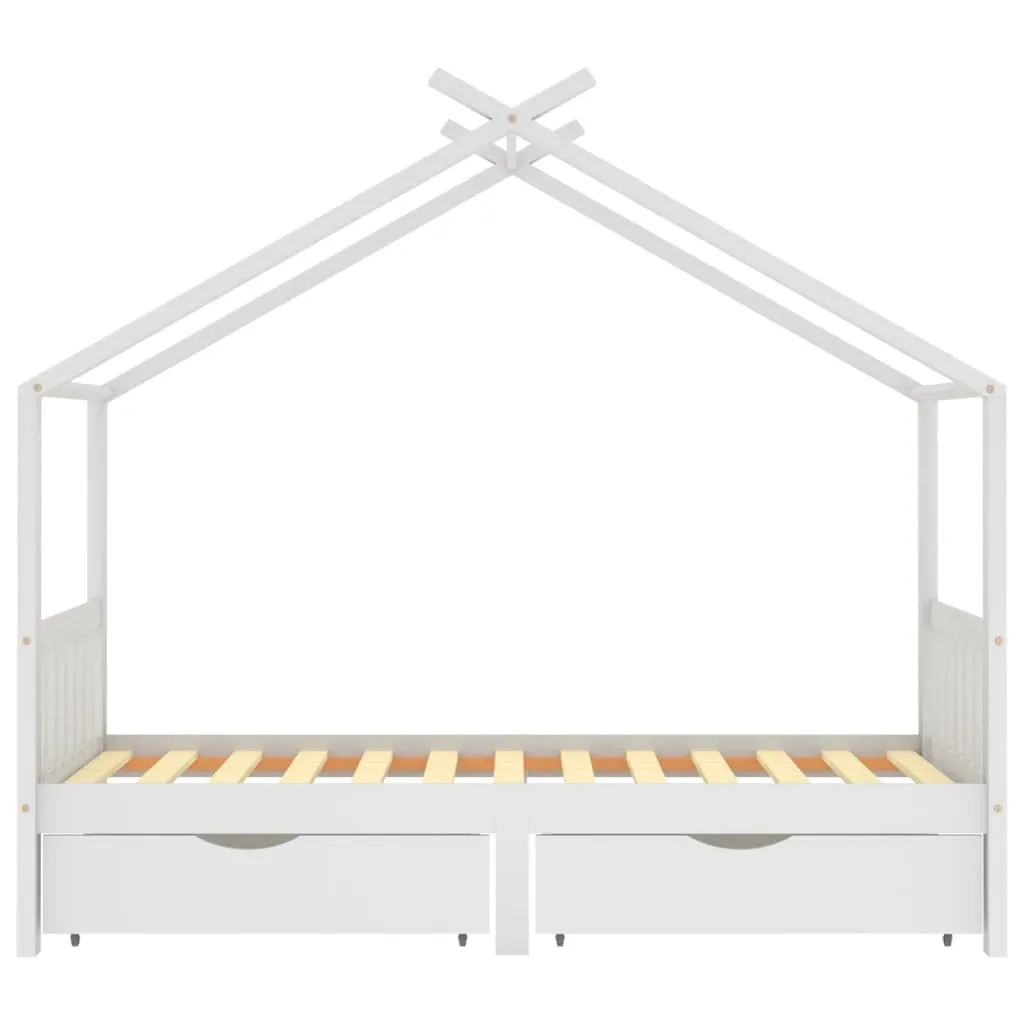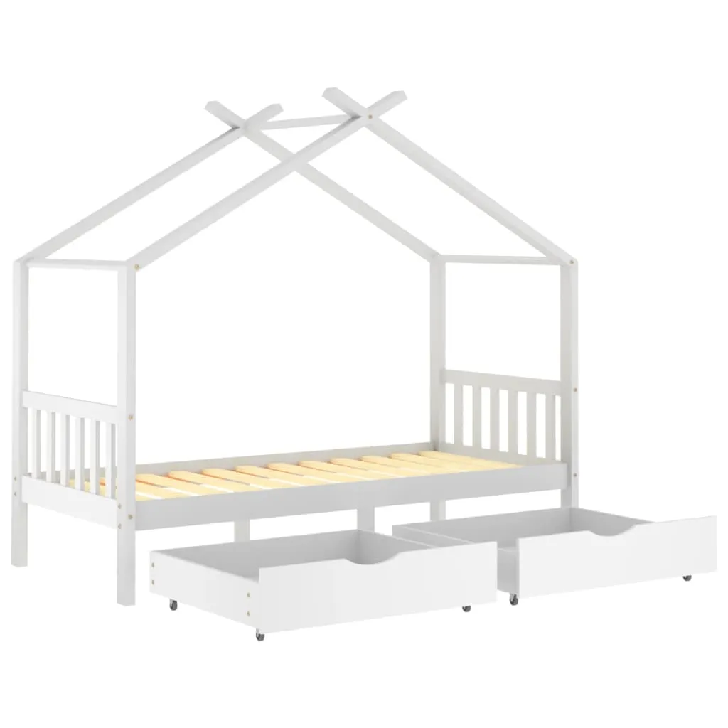 Das Holzbett für Kinder ist mit einem Bettrahmen im Baumhaus-Stil ausgestattet, an dem Bettvorhänge angebracht werden können. So kann dieses Betthaus mehr Privatsphäre für Kinder bieten. Mit dem passenden Zubehör kann es auch als Spielhaus dienen. Das aus massivem Kiefernholz gefertigte Bett ist äußerst stabil und langlebig. Die starken Latten bieten den nötigen Halt und Komfort. Die mitgelieferten Bettschubladen bieten reichlich Stauraum für Kleidung, Spielzeug, Bettwäsche usw. und halten das Kinderzimmer sauber und aufgeräumt. Die leichtgängigen Rollen laufen sowohl auf Teppichböden als auch auf Holzböden reibungslos. Dieses Bettgestell ist für eine Matratze von 90 x 200 cm ausgelegt.