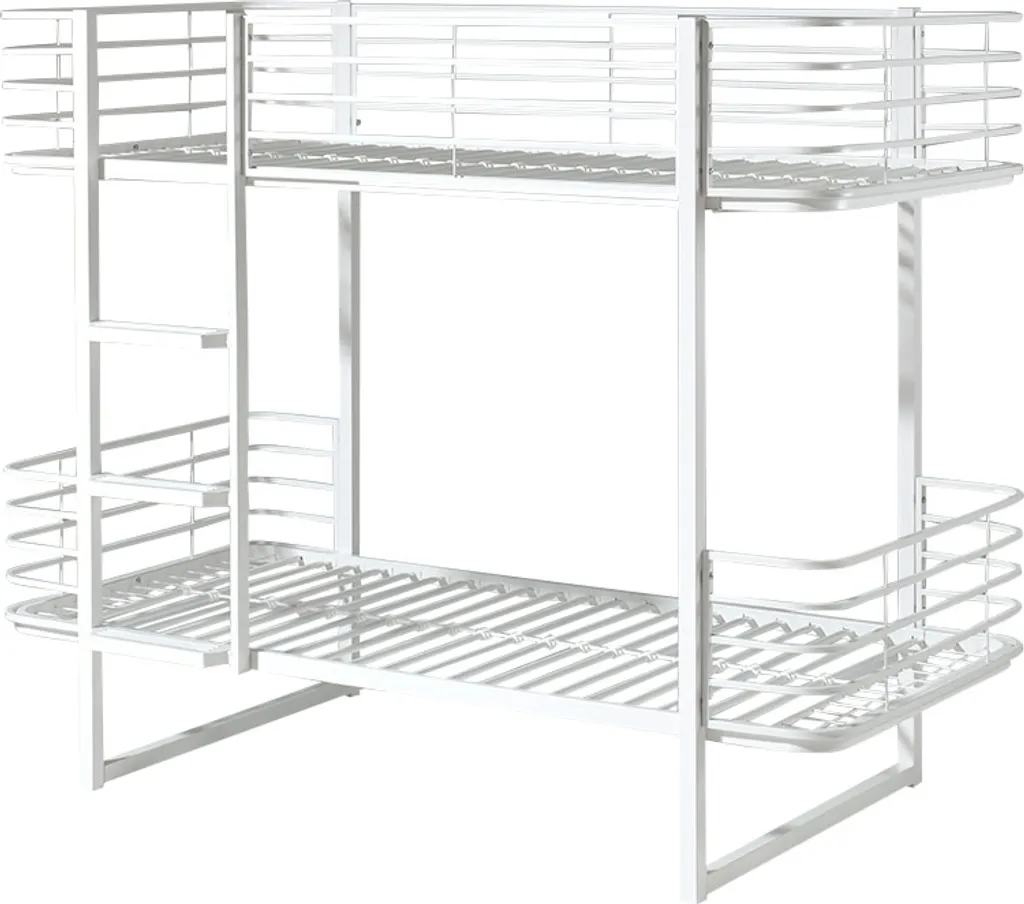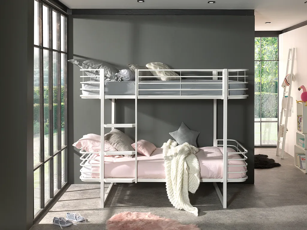 Das weiße Metall-Etagenbett der OSCAR-Kollektion hat einen einzigen Industrie-Look. Der rundum hohe Absturzschutz auf der obersten Liege und die breiten Stufen der Leiter machen dieses Etagenbett besonders sicher. Dieses Bett muss an der Wand montiert werden.