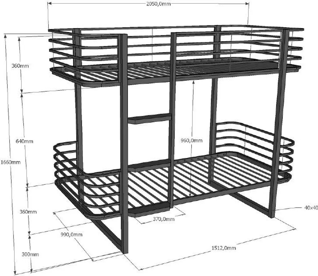 Die Ausführung ist Weiß, Metall pulverbeschichtet. Eine pflegeleichte Oberfläche die einfach mit einem handfeuten Tuch zu reinigen ist. Die übereinander befindlichen Liegeflächen sind für ein Matratzenmaß von 90 x 200 cm geeignet. Als Auflagebasis für die Matratze sind die Metallvertrebungen bereits inklusive. Die ausgefallene Optik, mit dem an Kopf- und Fußteil gerundetem Absturzschutz macht dieses Bett zu etzwas besonderem. Der hohe umlaufende Absturzschutz bei der oberen Liegefläche, sowie die breiten Trittstufen der Leiter (ca. 37 cm) bieten Sicherheit. Die tragenden Fußprofile haben eine Stärke von 40 x 40 mm und bieten eine hohe Standfestigkeit. Der Abstand zwischen den Liegeflächen beträgt ca. 96 cm, die Bodenfreiheit ist ca. 30 cm. Dieses Bett bietet gerade für kleine Kinderzimmer eine optimale Raumnutzung. Die max. Matratzenhöhe beträgt ca. 14 cm. Die benötigte Stellfläche ist ca. : B: 205 x H: 166 x T: 99 cm.