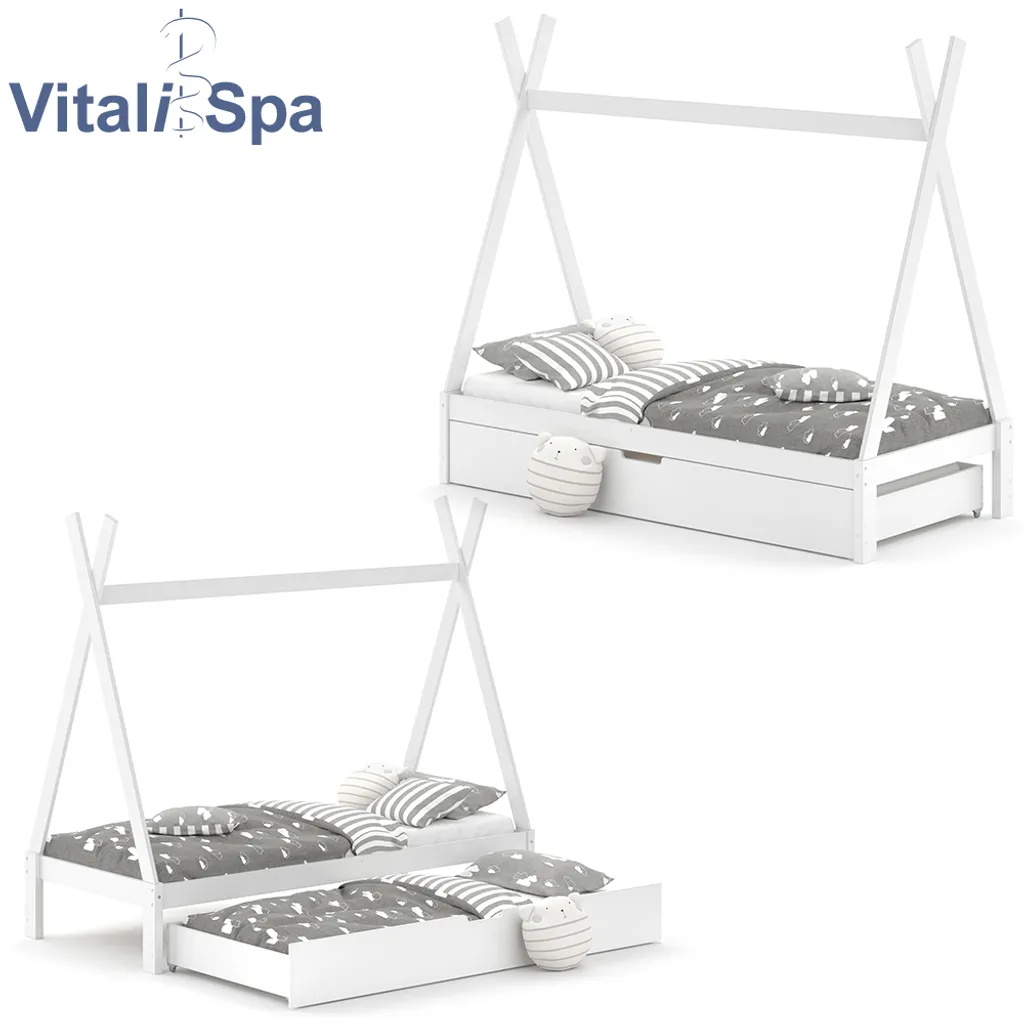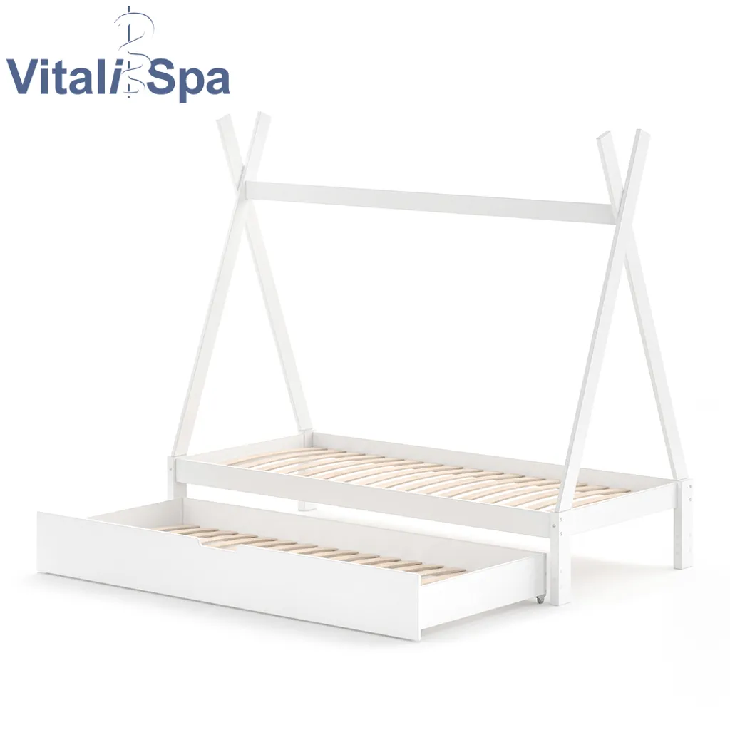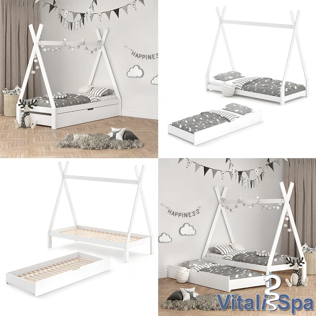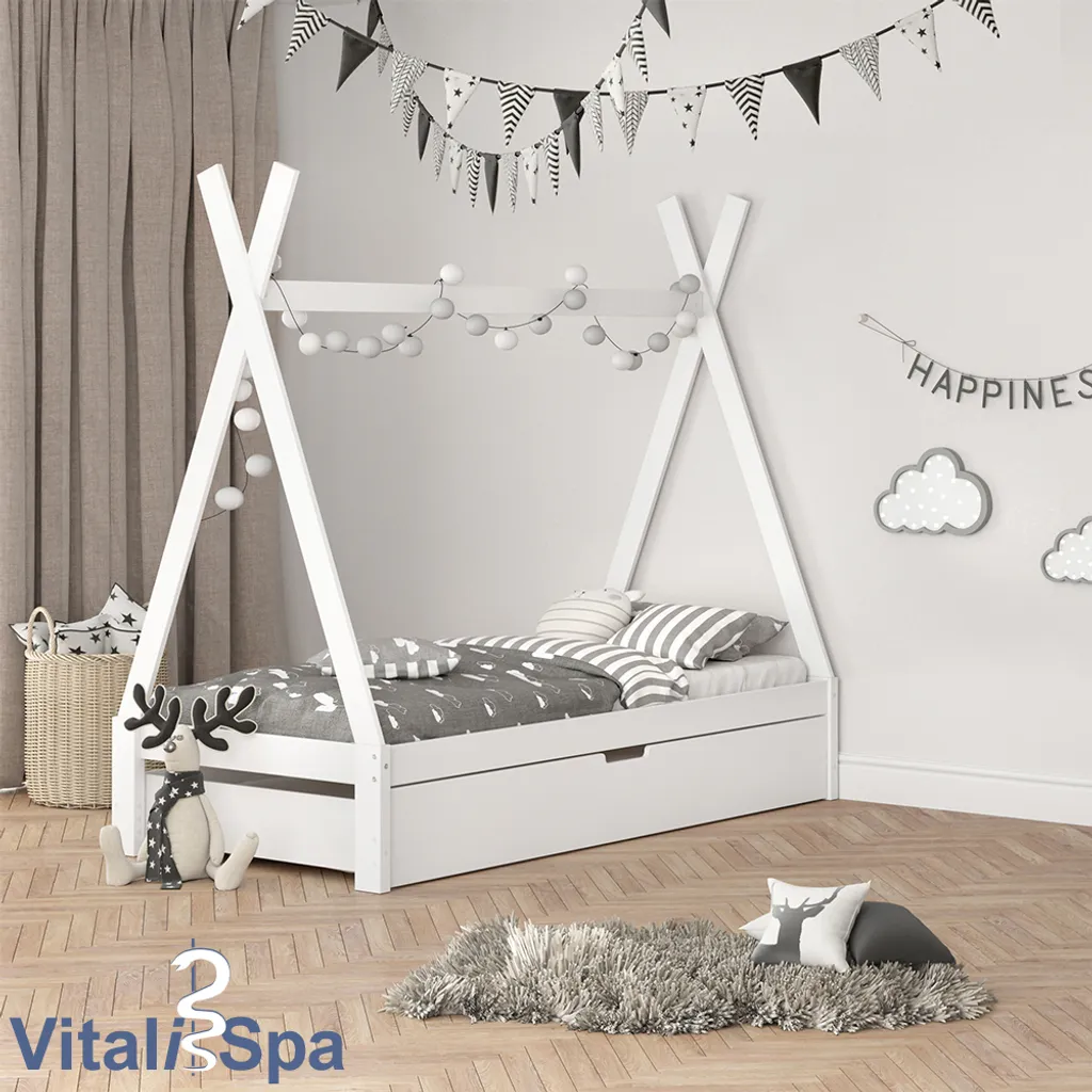 Der moderne skandinavische Stil dieses Naturholz-Möbelstücks passt in nahezu jede Kinderzimmereinrichtung. Ob Lichterkette, Wimpel, Betthimmel oder viele Kuschelkissen, die einzigartige Formgebung eröffnet viele Ideen und lädt zum Dekorieren ein. Lattenost dazu. Machen Sie sich und Ihrer Familie eine Freude mit unserem Kinderbett Tipi.
