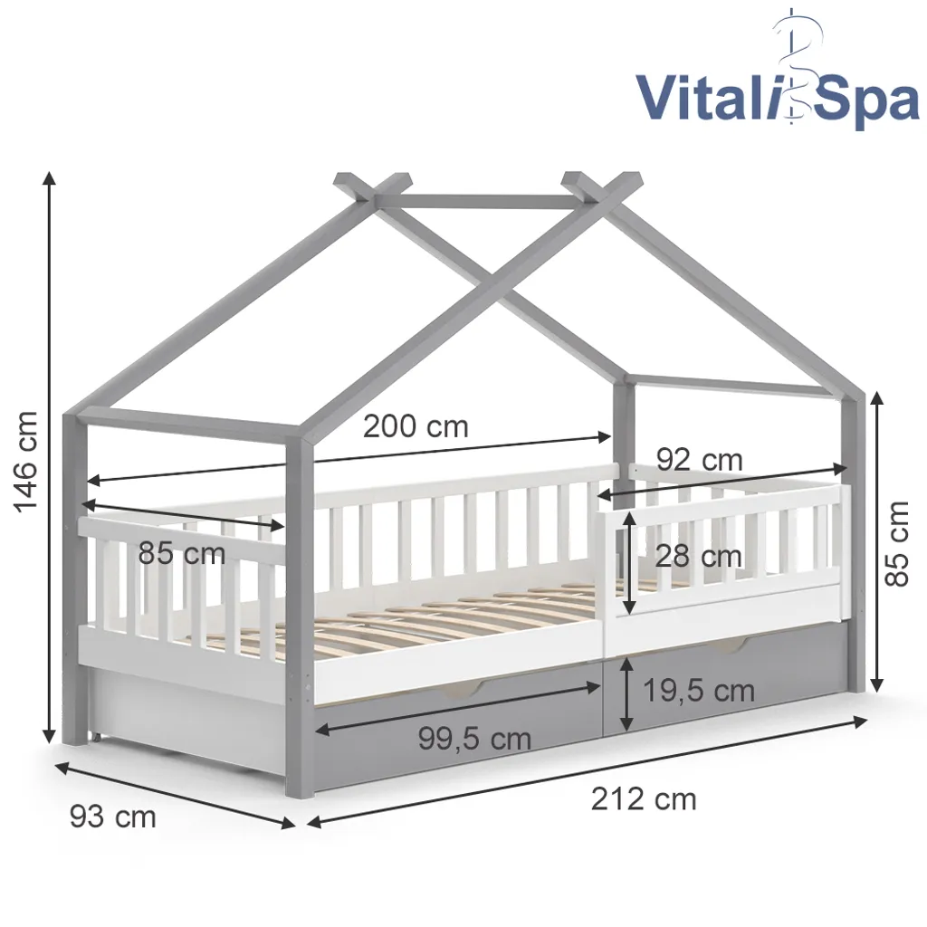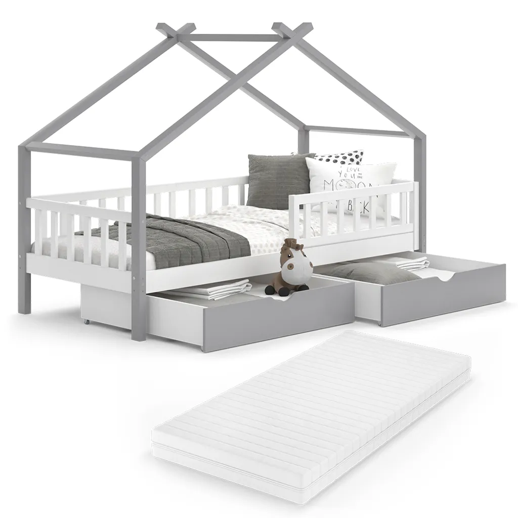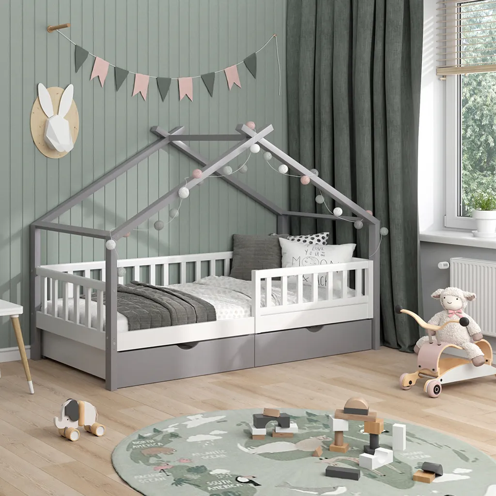 Dank der zusätzlichen Schubladen können darunter einfach und schnell Spielzeug, Kissen, Lieblingsbücher und andere Dinge ordnungsgemäß verstaut werden. Die Kombination aus dem Haus-Design und dem integrierten Rausfallschutz macht das Kinderbett zu einem Highlight in jedem Kinderzimmer.